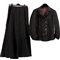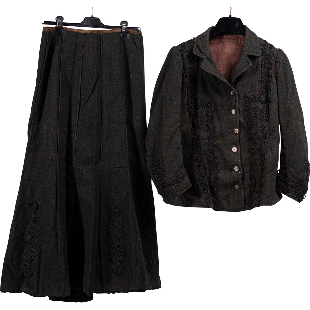 Abito femminile invernale in lana operata ,corpetto con colletto a revers e chiusura frontale, fornita da sei bottoni in madreperla intagliata. Sia il corpetto che la gonna sono arricchite da sovrapposizioni di passamaneria di seta color nero e piccoli cordoncini di seta. Confezionato per la M.sa Angela Sapio Rumbolo, sposata col M.se Francesco Cannarella di Scuderi di Licata.