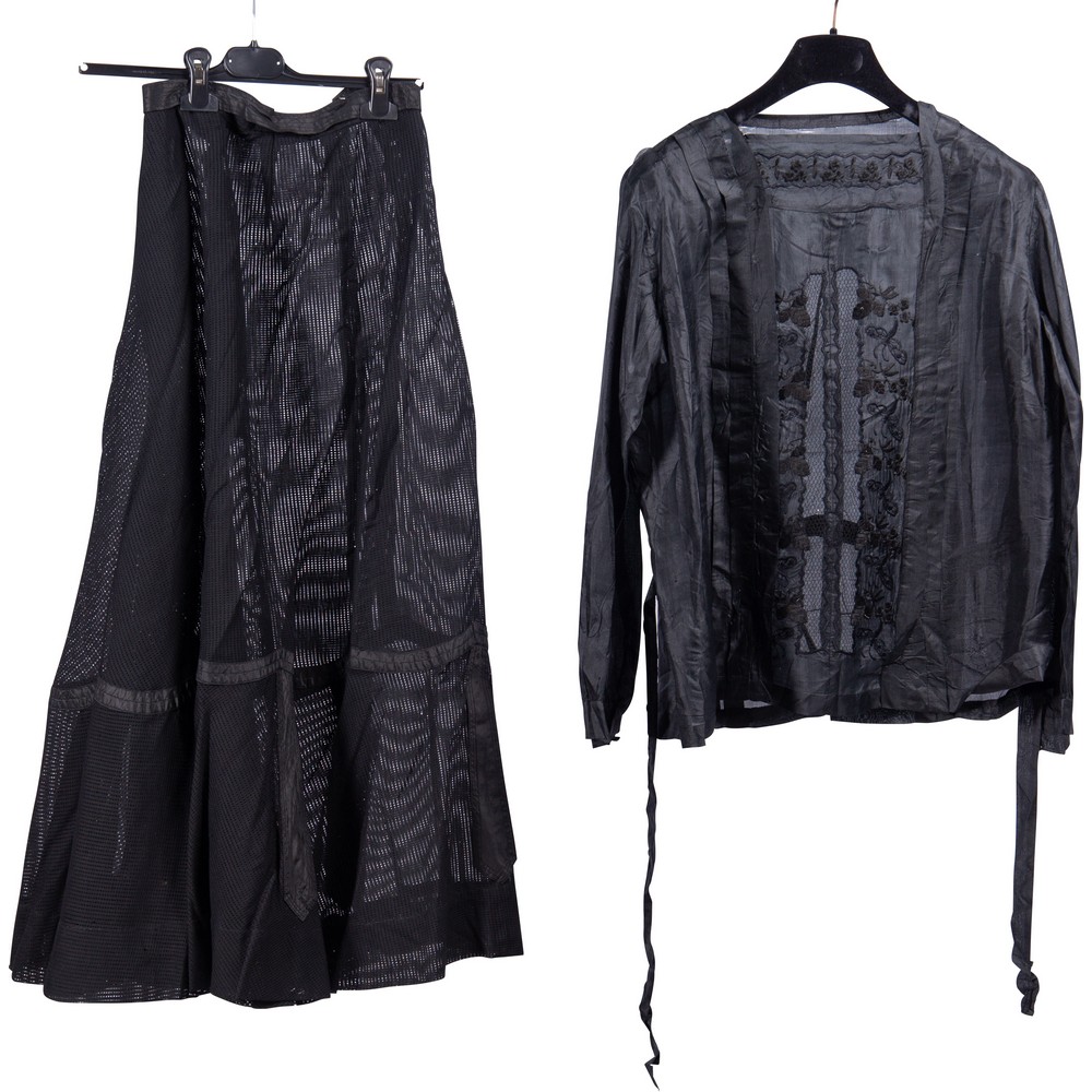 Abito in due pezzi in seta color nero, corpetto in seta colore nero con inserto di reticelle a punto pittoresco in filo di seta color nero. La gonna leggerissima e contornata da fasce di seta analoghe.