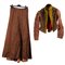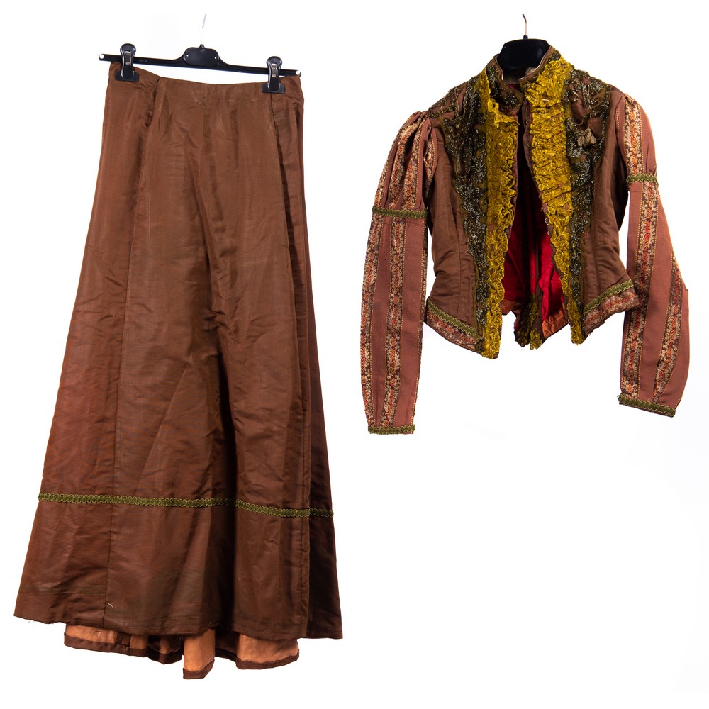 Abito femminile da passeggio in gros di cotone operato color marrone. Corpetto con chiusura frontale a ganci, pettorina arricchita da vasti inserti di pizzo colorato nei colori giallo e marrone. Le mostre e il colletto sono rivestiti da orli di motivi floreali di cannettes ad effetto cangiante in oro che scendono anche lungo il dorso. La gonna diritta orlata da un bordo di passamanteria.