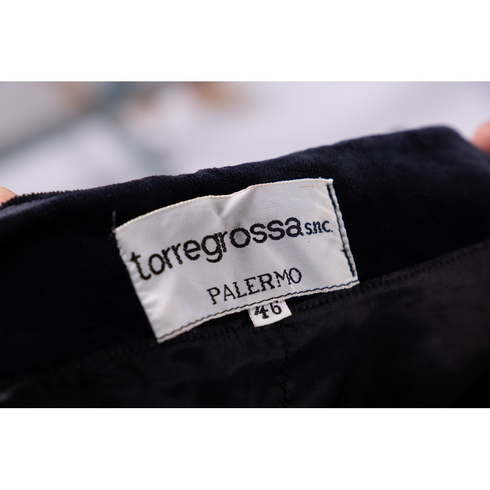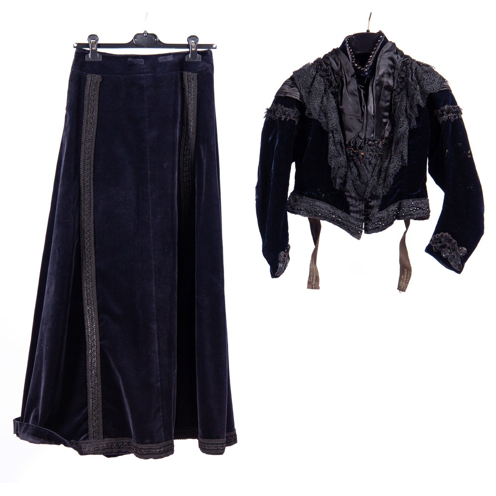 Abito femminile da sera in due pezzi in velluto blu notte, corpetto con chiusura frontale a ganci e pettorina con due bordi sciallati di raso di seta color nero, arricchita da un ampio volan di pizzo color nero e bordure di ciuffetti di velluto di ciniglia, vita contornata da una finta cintura di lustrini e coralline color nero, gonna diritta contornata da due ampie bordure di passamanteria in filo di seta color nero. Epoca 1895.