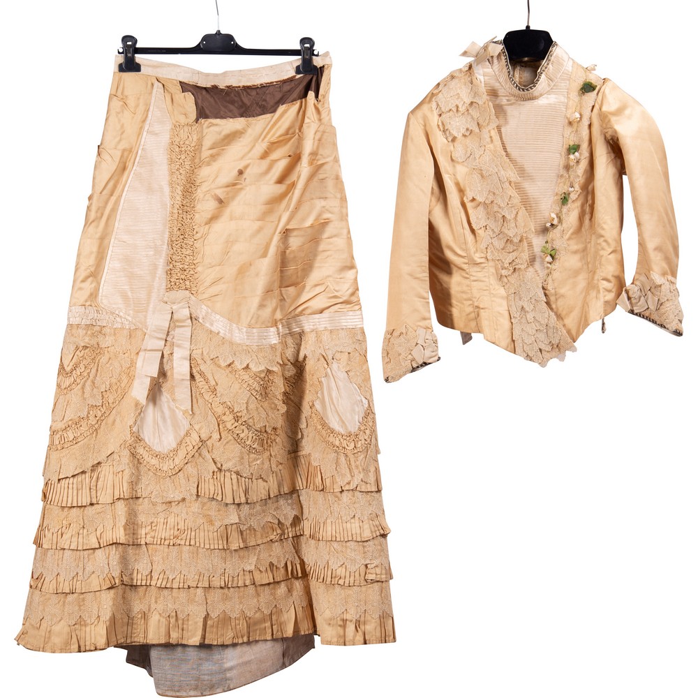 Particolarissimo abito da sposa in raso di seta color avorio. Il corpetto con allacciatura frontale fermato da diciotto ganci, aderentissimo ha una pettorina in raso di seta analogo, plissettato in senso orizzontale, bordato da balza ad arricciatura di valenciennes. Decorato da un orlo di fiori di zagara d'arancio in cera e organza cerata. Il colletto e le maniche, puntellate da scocche color avorio sono contornati da un orlo di passamaneria in velluto rivestito da un vistoso cordoncino in filigrana d'argento. La gonna, complessa nella struttura è decorata nella parte frontale da quattro balze di raso plissettate alternate da altrettante bordure di valenciennes. Il resto di essa è un continuo movimento ed incroci di aggrappature, increspature, arricciature e ventaglietti in raso color avorio e color beige, rifinito il tutto da bordure di valenciennes. Nella parte posteriore la gonna, fornita di cul de Paris, è movimentata da aggrappature e nella parte terminale, in modo inconsueto, presenta quindici bottoni rivestiti ai quali viene aggiunto uno strascico sempre in analogo tessuto, bordato da plissettature ed un orlo di trina. Rarissima e inconsueta l'elaborazione di questa aggiunta che pone l'abito in un indice di rarità sartoriale. Epoca 1886