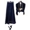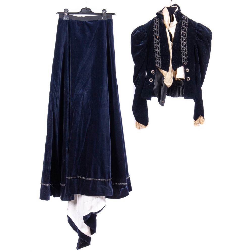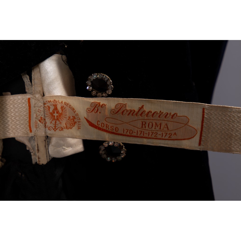 Abito da sera in due pezzi color bleu notte, corpino ad amazzone con maniche a gigot taglio a frac evidenziato da una bordura di coralline e lustrini che evidenziano le mostre svettanti su una pettorina di organza finissima color avorio che nasconde la chiusura frontale. Il punto vita è evidenziato da una grossa fascia plissettata in raso color nero, puntellata da quattro bottoni con lustrini e zaffiri bianchi. La gonna cade diritta con un leggero strascico. Epoca 1890.