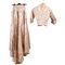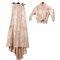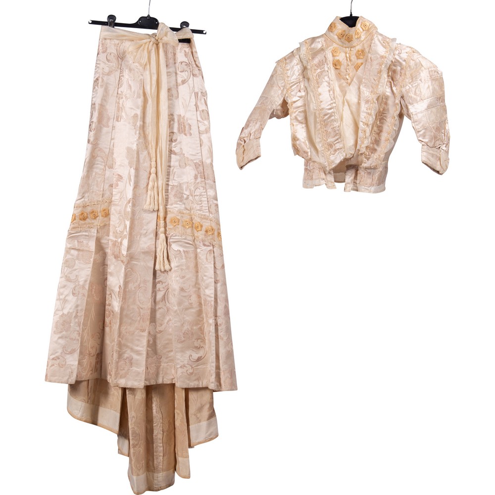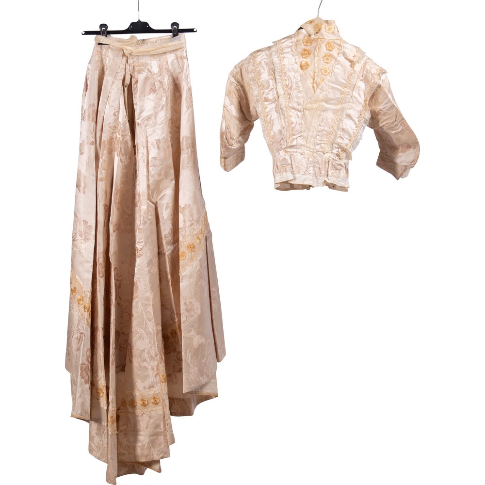 Abito da sposa in due pezzi. Corpino in raso di seta color avorio fornito di chiusura frontale, raso di seta operato color avorio intervallato da sovrapposizioni e strisce di organza impalpabile traforata e ripiegata a plissettature o ventaglietti, rifinita da passamaneria in filo di seta color avorio, pettorina e colletto ottenute da un rivestimento in tulle di seta decorato da grossi fiori in filo di seta color giallo oro, maniche a coscia di montone corte al gomito, ferme ai paramani da una fascia di organza traforata puntellate da una scocca. Girovita fermato da una fluttuante fascia di organza traforata terminante con due lunghe nappine in filo di cotone. La gonna cade diritta sul davanti ornata da quattro piegoni verticali ed è bordata interamente a svasare da due fasce di tulle di seta bordate da ventaglietti di organza e decorate da fiori in filo di seta color avorio. Epoca 1880.