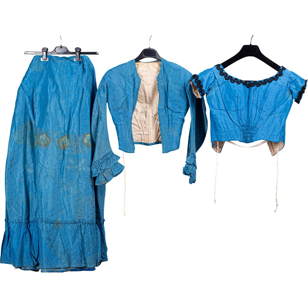 Abito da passeggio in 3 pezzi in rigatino di seta operato color celeste con chiusura frontale a ganci e vita a punta calata, maniche molto aderenti con arricciature nei paramani in analogo tessuto, corpetto da ballo con chiusura a ganci frontale bordato nella scollatura e nelle maniche a palloncino da un orlo di passamaneria color nero in corallina, gonna molto ampia, termina con una vasta balza in analogo tessuto arricciato. Epoca 1865.