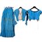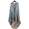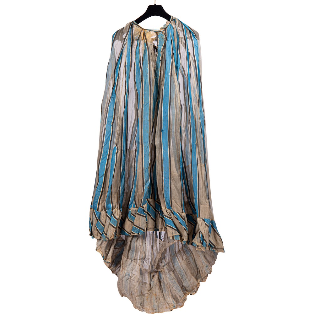 Gonna in organza color bianco decorata a strisce azzurro nero e bianco. Ampia balza nella parte inferiore. Epoca 1860.