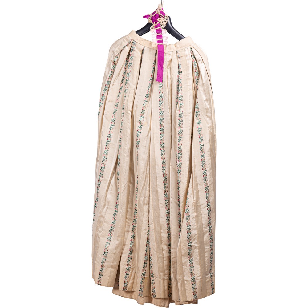 Gonna seta operata a strisce color avorio rasate e bordi verticali con motivi floreali policromi a punto pittoresco. Il punto vita, rivestito di un velluto color nero vede applicata con allacciatura una cintura di pizzo con passanastro, e un nastro color fucsia. Manifattura siciliana.