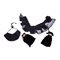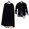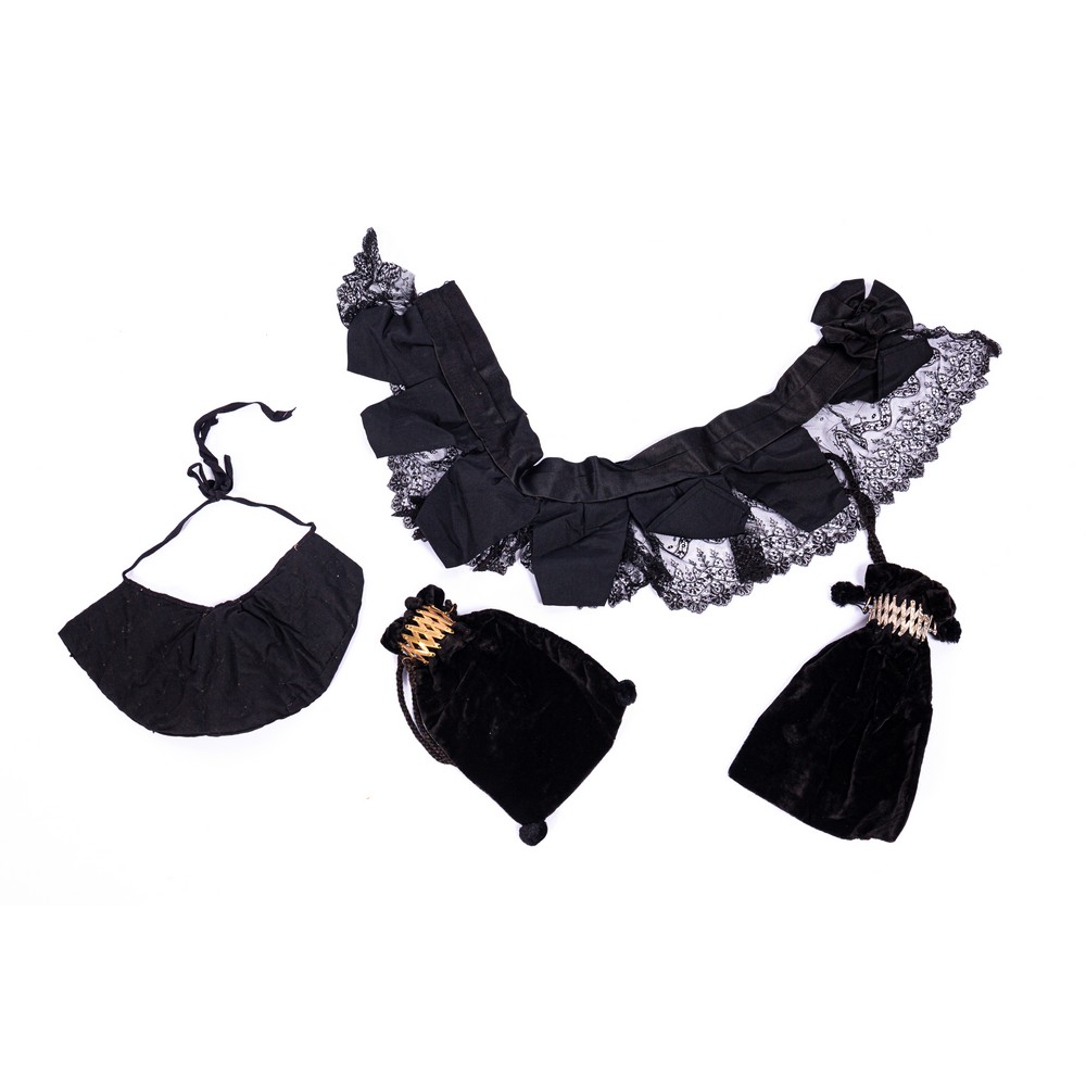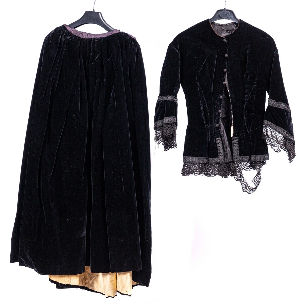 Abito da sera in due pezzi in velluto color nero. Corpetto con chiusura frontale fornito di sei bottoni foderati. Il centro vita è guarnito da un vasto orlo di pizzo a doppio spiovente, che contorna anche le maniche. L'abito si correda di due borsette a pochette con chiusura arricciata in metallo argentato e dorato, sempre in velluto color nero. Manifattura siciliana Epoca 1860.