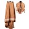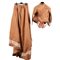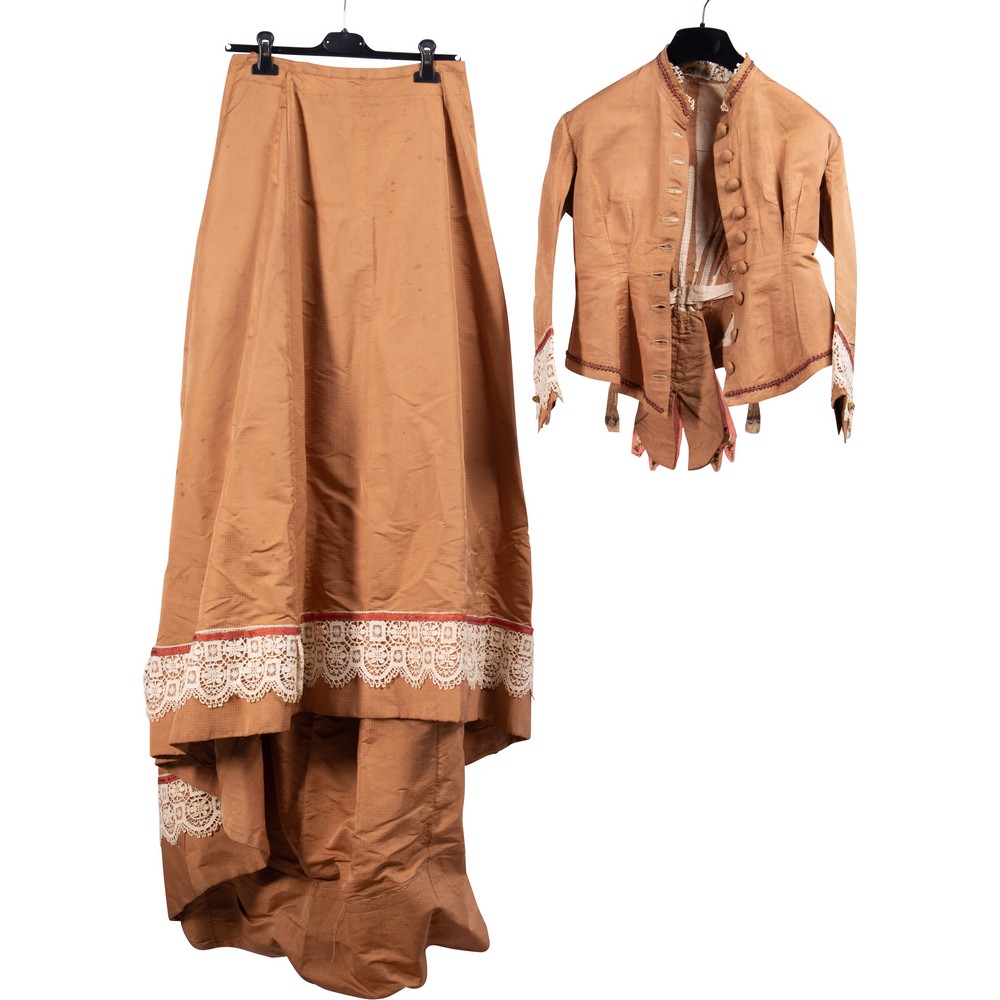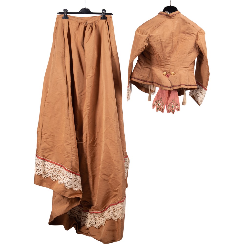 Abito da passeggio in due pezzi in taffetas di seta color albicocca operato a quadretti. Corpetto dalla vita aderente ha l'apertura frontale fermata da dieci bottoni foderati in analogo tessuto. Il collettino a pistagna e il bordo del corpetto inferiore sono decorati da un cordoncino di passamaneria in piccolissimi flint glass a treccia con nastro di seta rosa. La parte posteriore è puntellata da due bottoni laminati in oro e da due scocche in seta cruda ricamate con fiori policromi in seta. Le maniche sono adorne ai paramani da fasce di pizzo molto larghe e da un cordoncino di passamaneria color rosa, sono anch'esse puntellate da due bottoni laminati in oro. La gonna cade diritta, vaporosa e ampia con una forte tournure posteriore ed ampio strascico decorato da una balza di pizzo analogo a quello delle maniche. Epoca 1865.