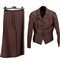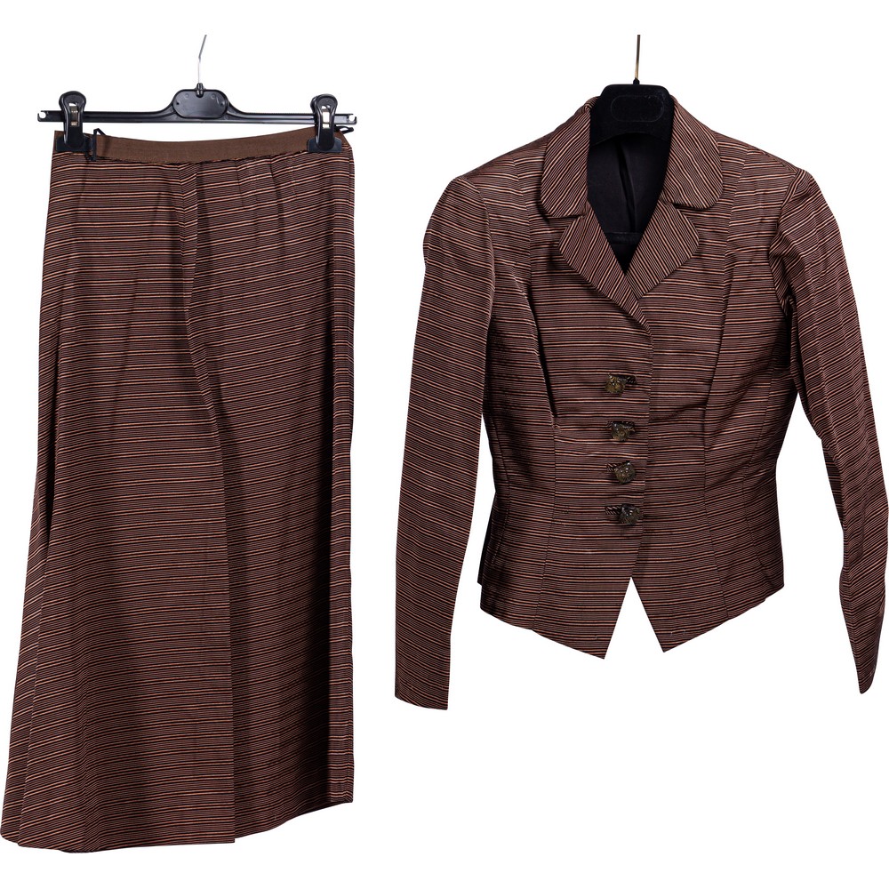 Tailleur in rigatino di seta e velluto color marrone con colletto e piccoli revers a chiusura sul davanti. Fornita di quattro bottoni in bachelite in analogo colore. Manifattura Donati Tabaroni (Bologna).