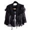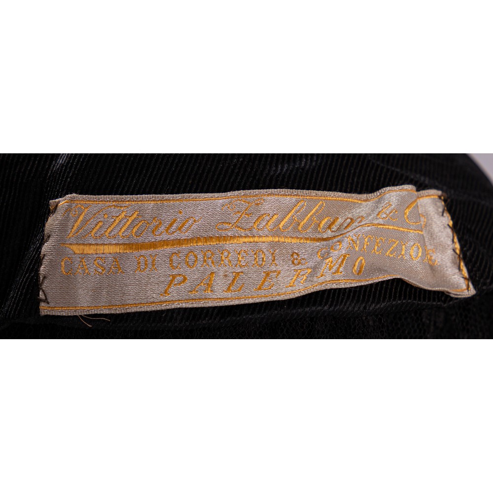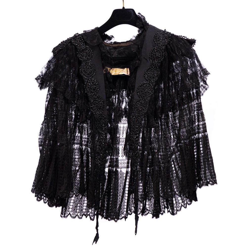 Mantella alla pellegrina da sera interamente in pizzo chantilly smerlato, ha due balze nella parte superiore, vasta bordura di toulle color nero operato a motivi floreali. Le mostre in ottomano bordate da grandi teorie a spirale di lustrini. Chiusura frontale a scocche in raso di seta color nero.