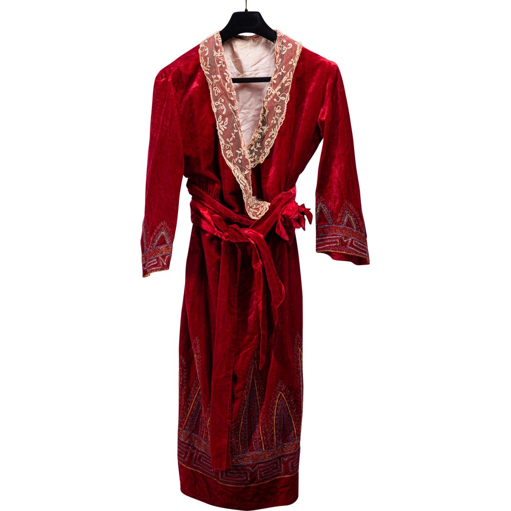 Abito da sera in velluto di ciniglia, con maniche a campana rifinite con decorazioni policrome a code di pavone in filo di seta color verde, celeste, avorio, verde acqua, giallo oro e argento. La scollatura è sciallata con largo bordo di pizzo ai fuselli. Il punto vita vede una cintura in analogo tessuto puntellata da un grosso bottone che genera un grande fiore con struttura metallica interna da cui scende una larga fascia che pende fino all’estremità inferiore. La parte inferiore è tutta contornata con lo stesso motivo delle maniche che ripete queste code di pavone in filo di seta policromo.