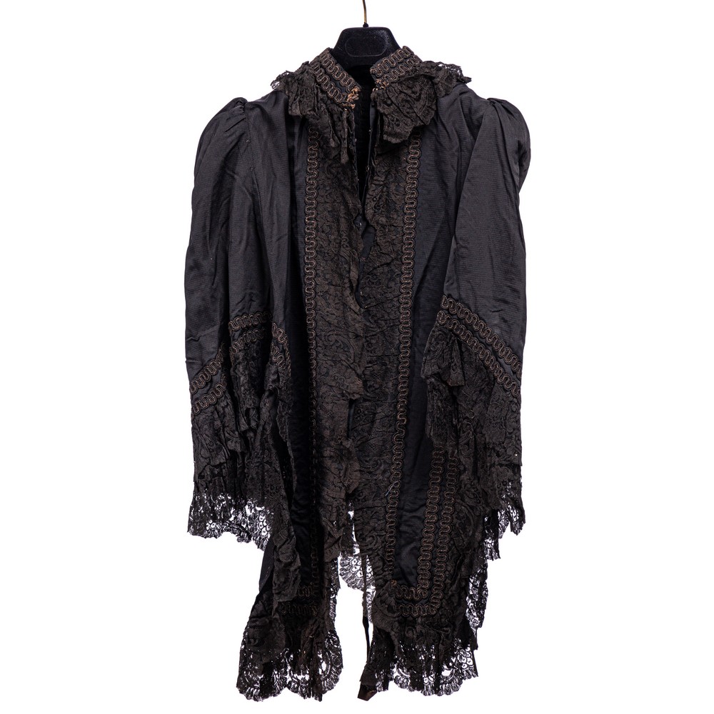 Mantella alla pellegrina da sera in rigatino di seta color nero interamente bordata da orli di pizzo di valenciennes nero, e passamaneria in seta a serpentina color nero. Nella parte posteriore, le due code sono centrate da una stupenda scocca in seta con nappine rigide di seta.