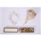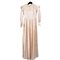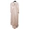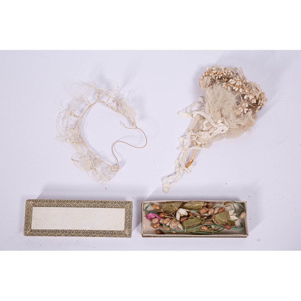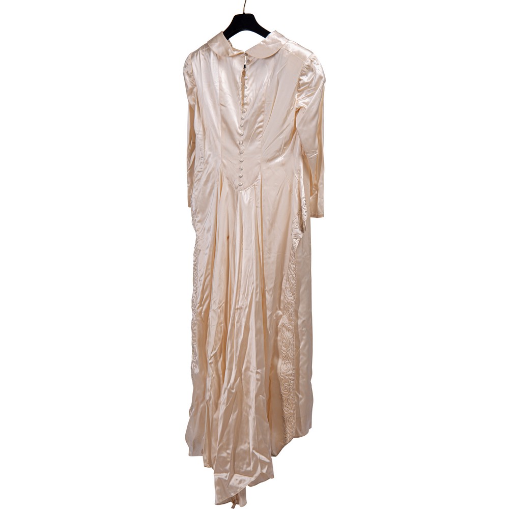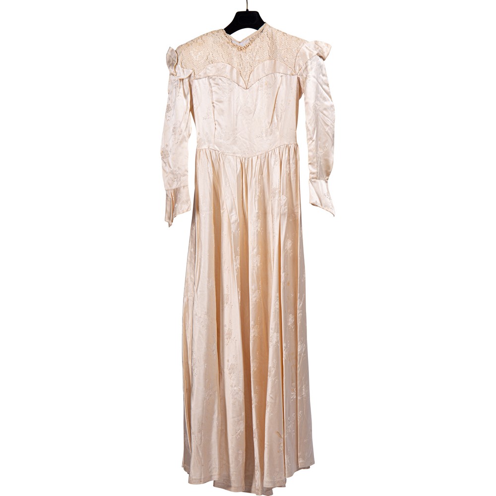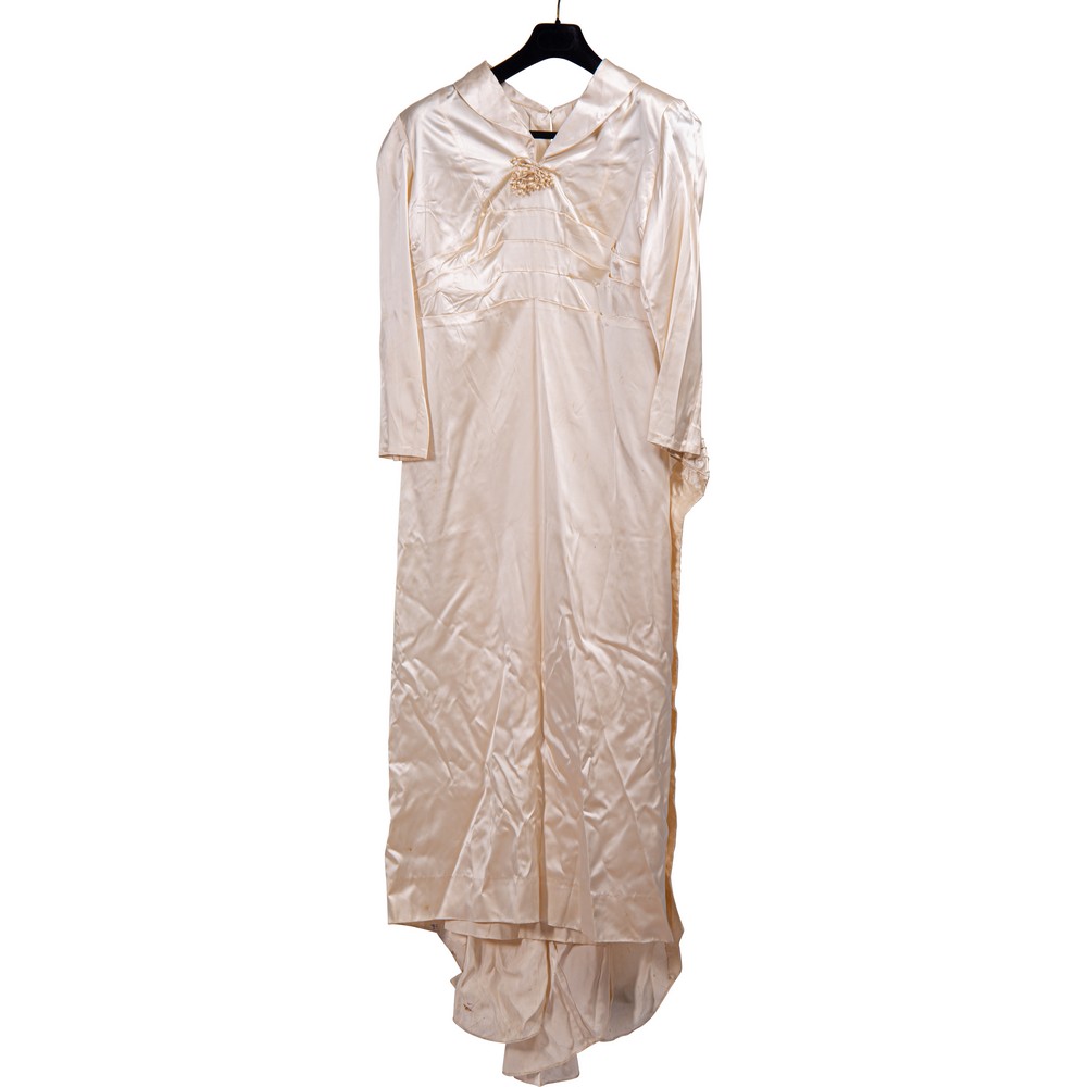 Abito da sposa in raso colore avorio operato a motivi floreali. Nella parte frontale il salva pudore è rivestito da un vasto inserto di macramè color avorio che lo borda fino al collo, cinto da un tralcio di fiori di zagara in cera, chiusura a bottoncini foderati, puntellata da una grossa scocca in analogo tessuto. Epoca 1930.