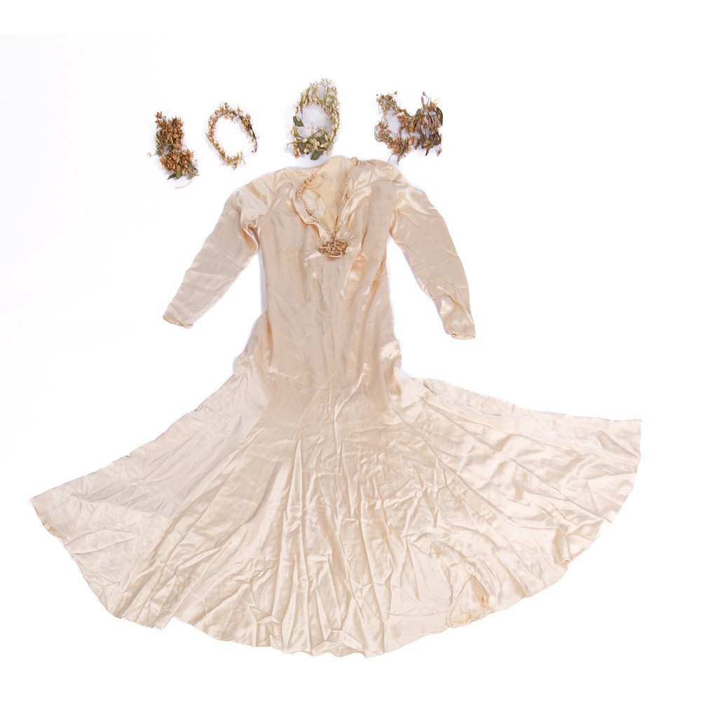 Abito da sposa in raso di seta color avorio, taglio a punta nella parte frontale, sul petto una grossa scocca di fiori di zagara in cera, gli stessi sulla scollatura .Maniche ai polsi fermate da doppia coppia di grosse perle coltivate. Nella parte posteriore, scendono dal collo due fasce reggi velo e sulla schiena una grande scocca.