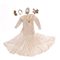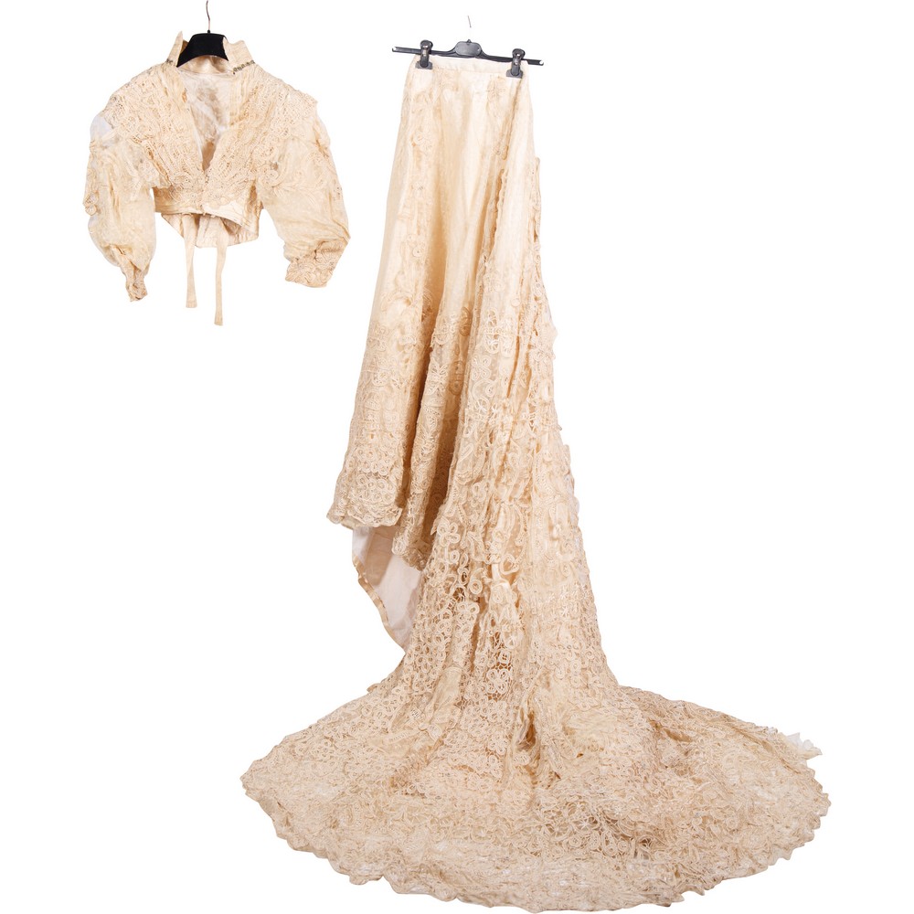 Abito da ballo in seta e pizzo avorio composto da due pezzi. Un corpetto sagomato con chiusura frontale decorato con splendido pizzo operato a mano, punto vita chiuso da fascia in seta. Maniche con grossa rigonfianza. Gonna con ampio strascico in pizzo operato a mano. Usure.