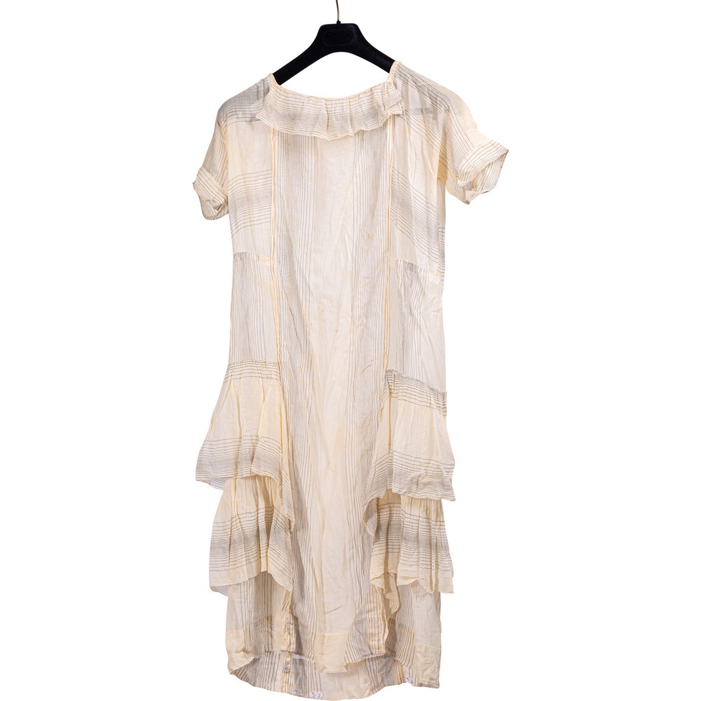 Abito da mattina alla charleston in cotone color avorio operato a piccole strisce color nero, arricchito da volani e balze arricciate. Epoca 1920.