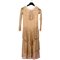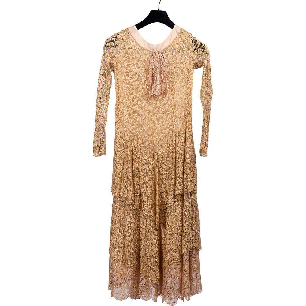 Abito da sera alla Charleston, in pizzo di chantilly color giallo oro, scollatura con bordatura di raso di seta color rosa con piccolo Jabots in analogo pizzo in colore leggermente differente plissettato, maniche orlate diritte e strettissime chiuse da otto automatici. La parte terminale con balze orlate. Epoca 1925.