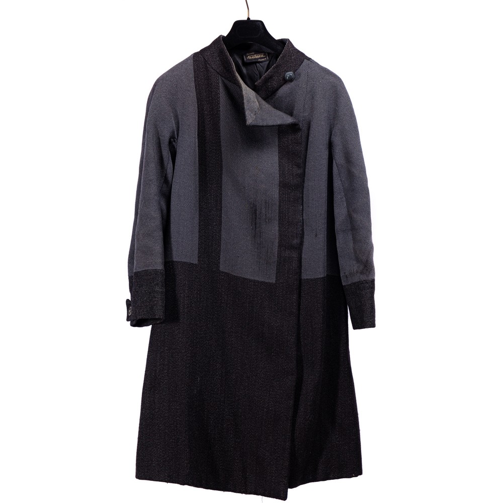 Cappotto in lana nera e grigia, apertura laterale frontale, collo rotondo, due strisce in tessuto nero marcano in tutta altezza il fronte, maniche grigie con alta balza nera.
