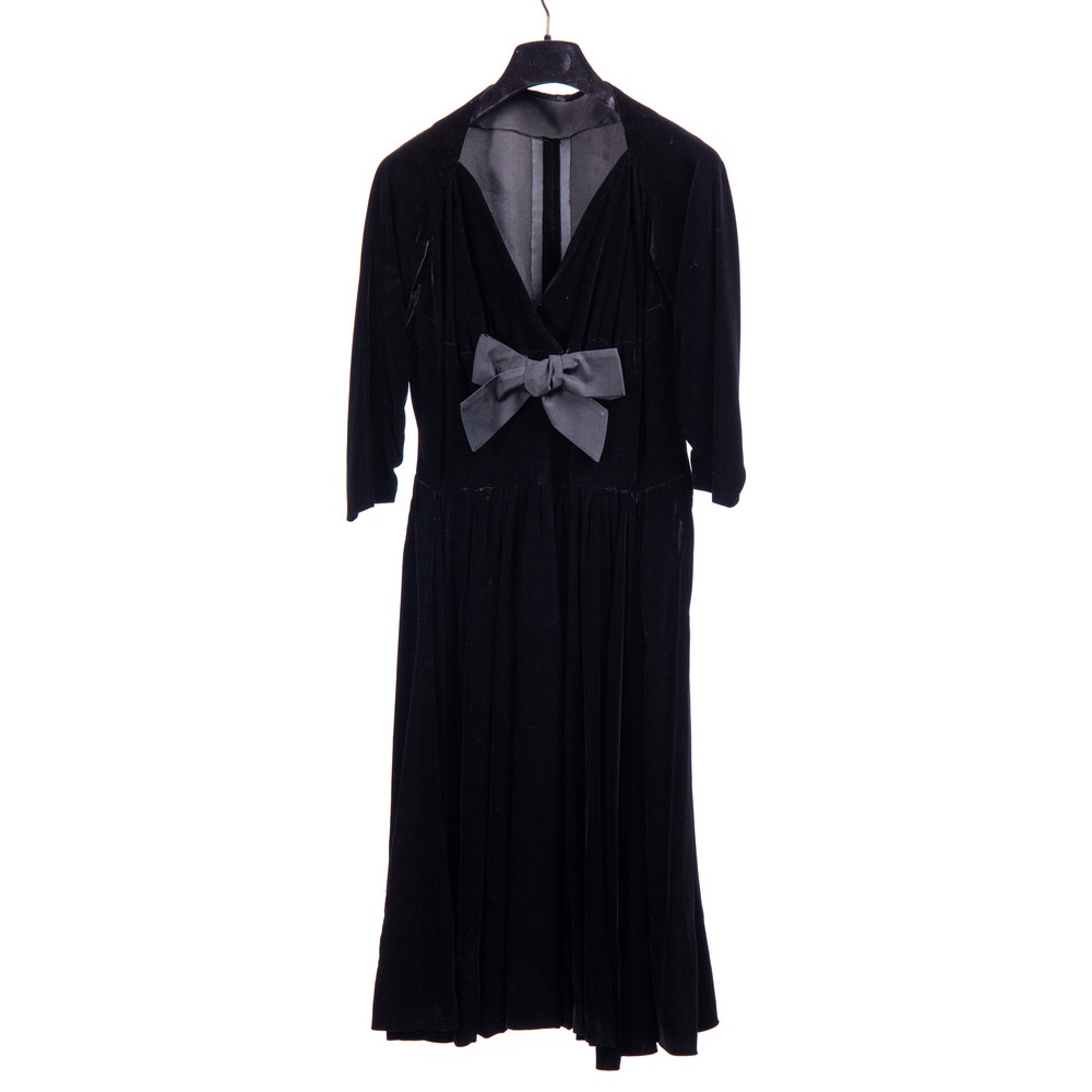 Abito femminile da sera in velluto color blu notte grande scollatura con scocca in raso di seta sopra il punto vita. Maniche corte arricciate ai polsi. Etichetta: Donati Tabarroni - Bologna