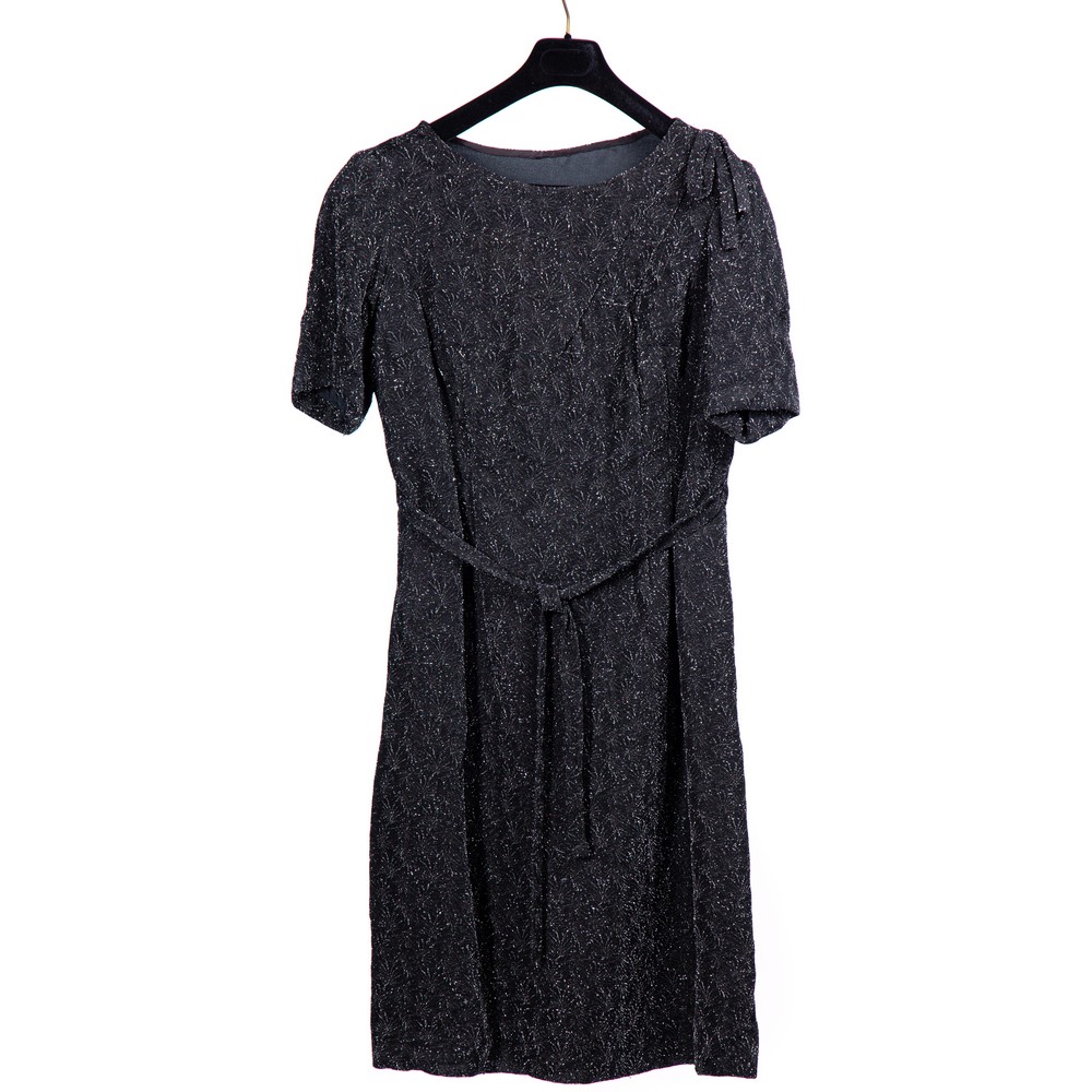 Abito da sera color nero e argento in cotone intessuto di filo d'argento fornito di cinturino in analogo tessuto e piccolo fiocco sulla spalla sinistra. Manifattura Siciliana. Epoca: 1940.