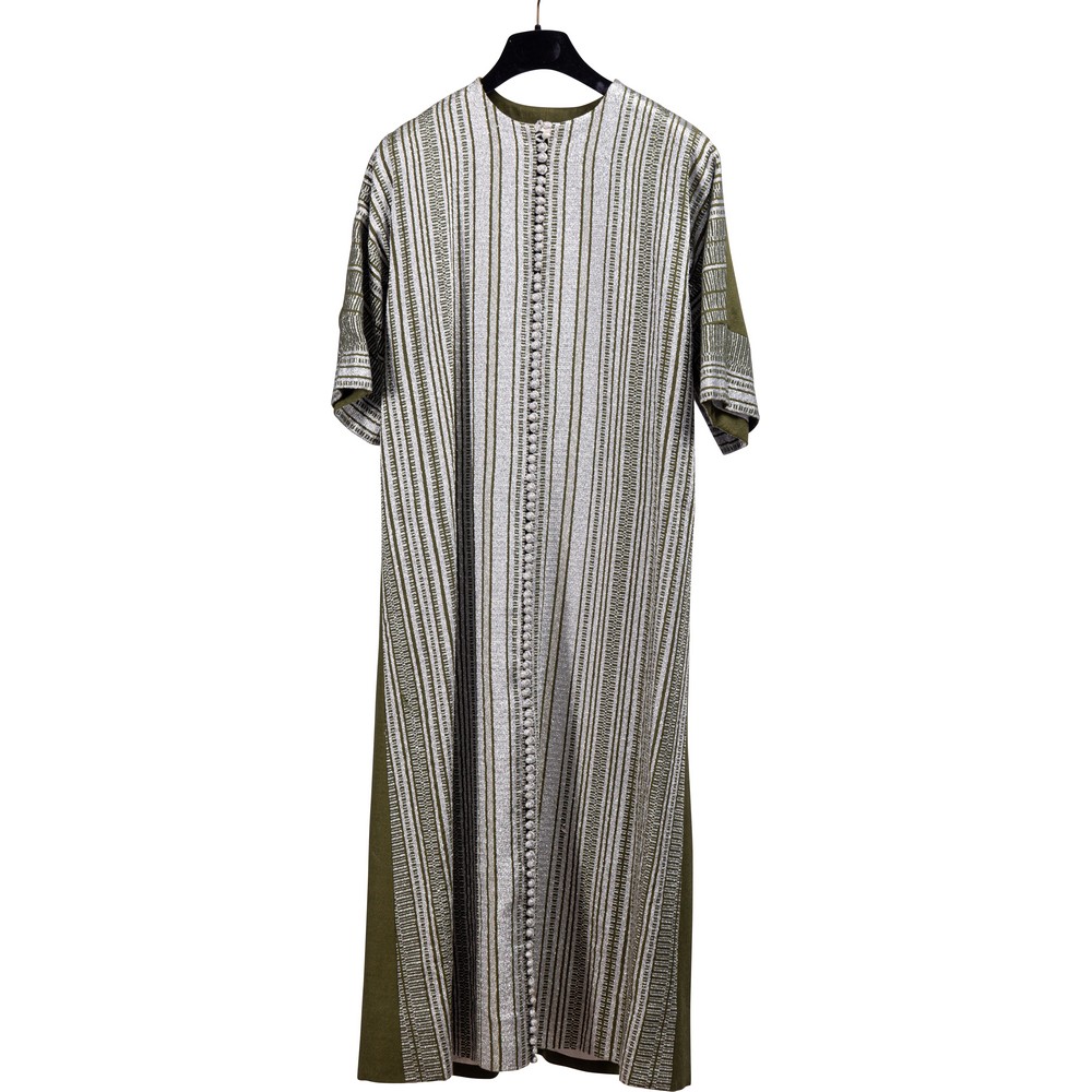 Splendido abito da sera in un pezzo in cotone operato color verde militare. Epoca 1960.