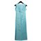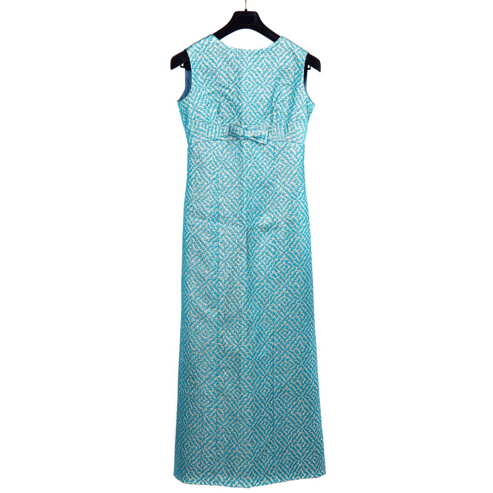 Abito da sera in un pezzo, dalla linea sinuosa in tessuto di lamé, con trame geometriche argentate e celesti, al punto vita un finto cinturino puntellato da una scocca. Misure: Vita 45 cm - Lunghezza tot. 134 cm.