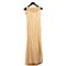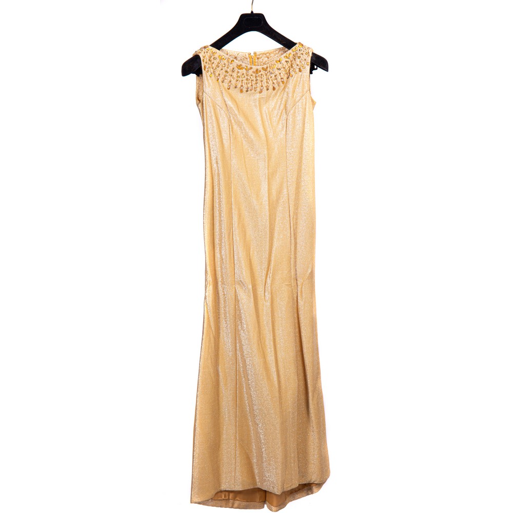 Abito da sera in un pezzo, rivestito in tulle di lamé, dalla linea aderente e sinuosa, bordato nella scollatura da applicazioni di cannettes, lustrini e gocce con pietre dure dorate. Misure: Vita 50 cm - Lunghezza tot.134 cm - Circonferenza tot. 170 cm.
