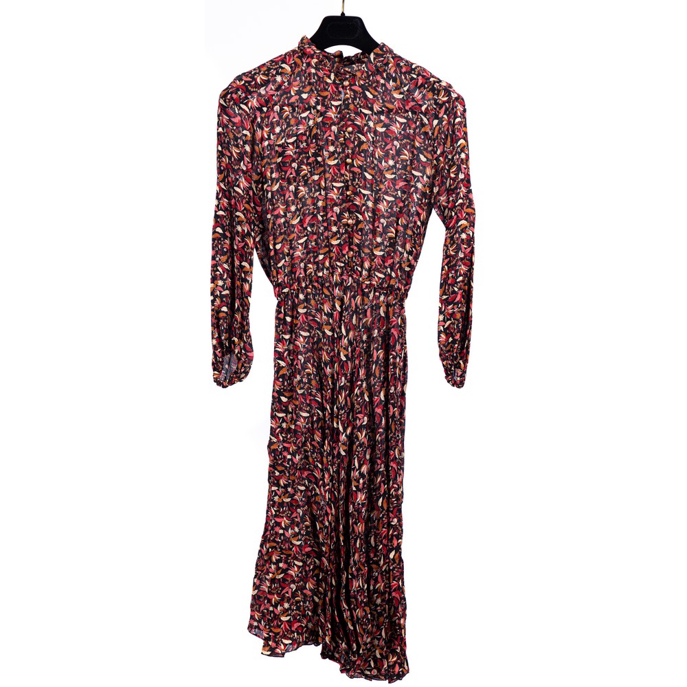 Abito in un pezzo in crepe di seta fondo nero operato con palmizi e motivi floreali nei colori avorio, aragosta e marrone. Chiusura Posteriore fornita di sei bottoni in vetro madreperlato. Arricciatura al collo, alla vita e alle maniche. Epoca 1930.