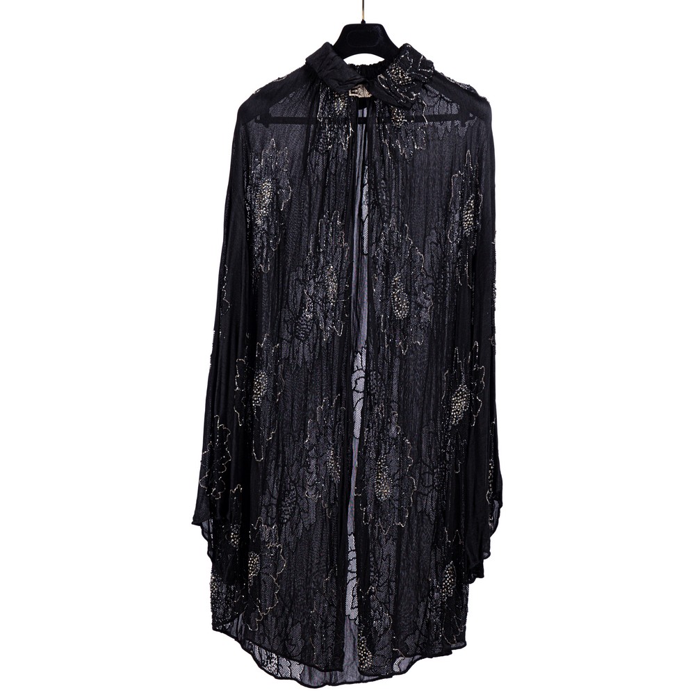 Mantella da gran sera elegantissima in rigatino di seta interamente smerlato con decorazioni a motivi floreali su rete di filo di seta color nero, questi motivi floreali sono evidenziati negli orli da teorie di cannette nelle corolle dei fiori da centinaia di strass, sia per tutta la mantella nel davanti e nel dietro che nelle maniche lunghe a campana. Il Colletto ampio ed arricciato, decorato in analoga maniera e puntellato da una doppia chiusura rivestita in zaffiri bianchi. Epoca 1925.
