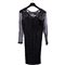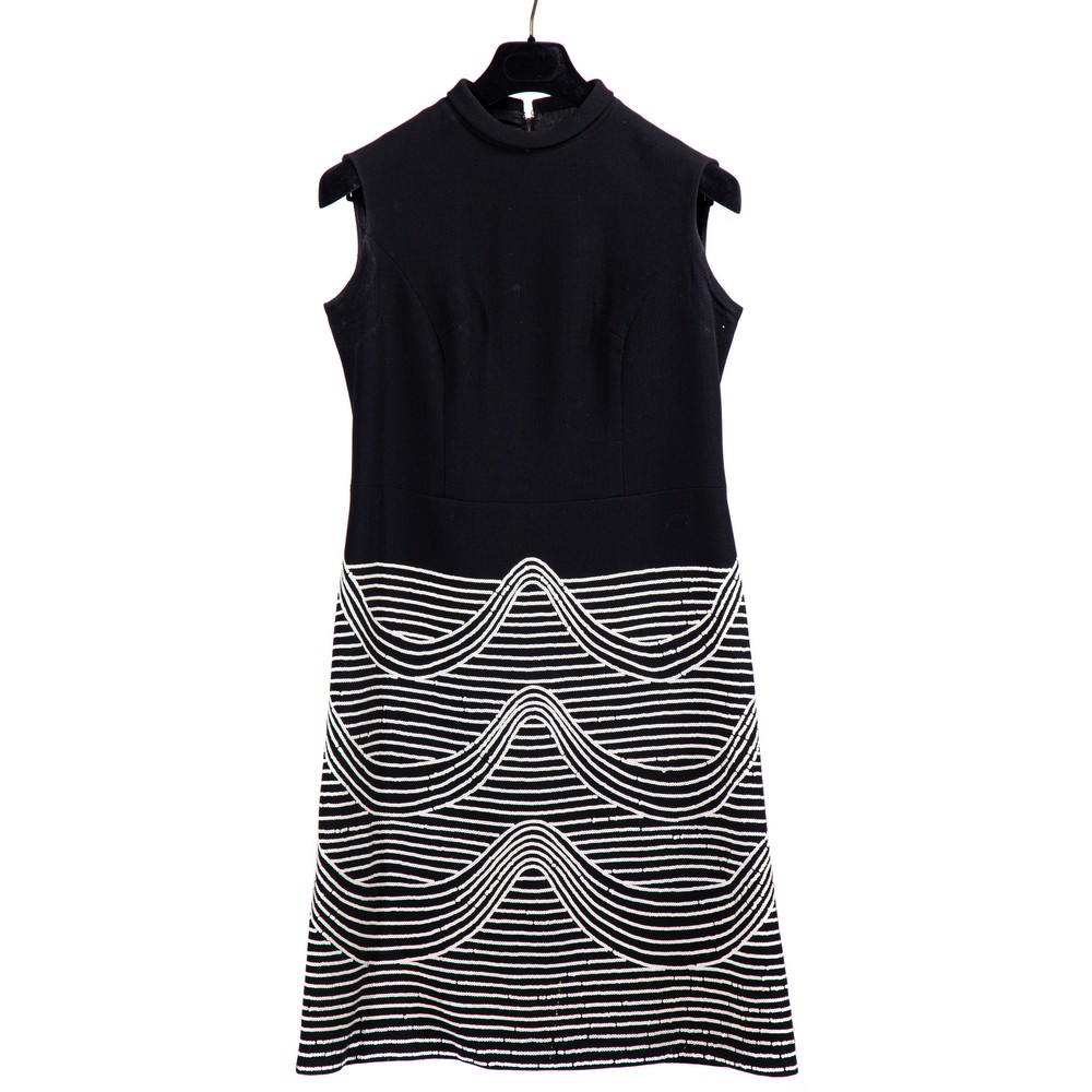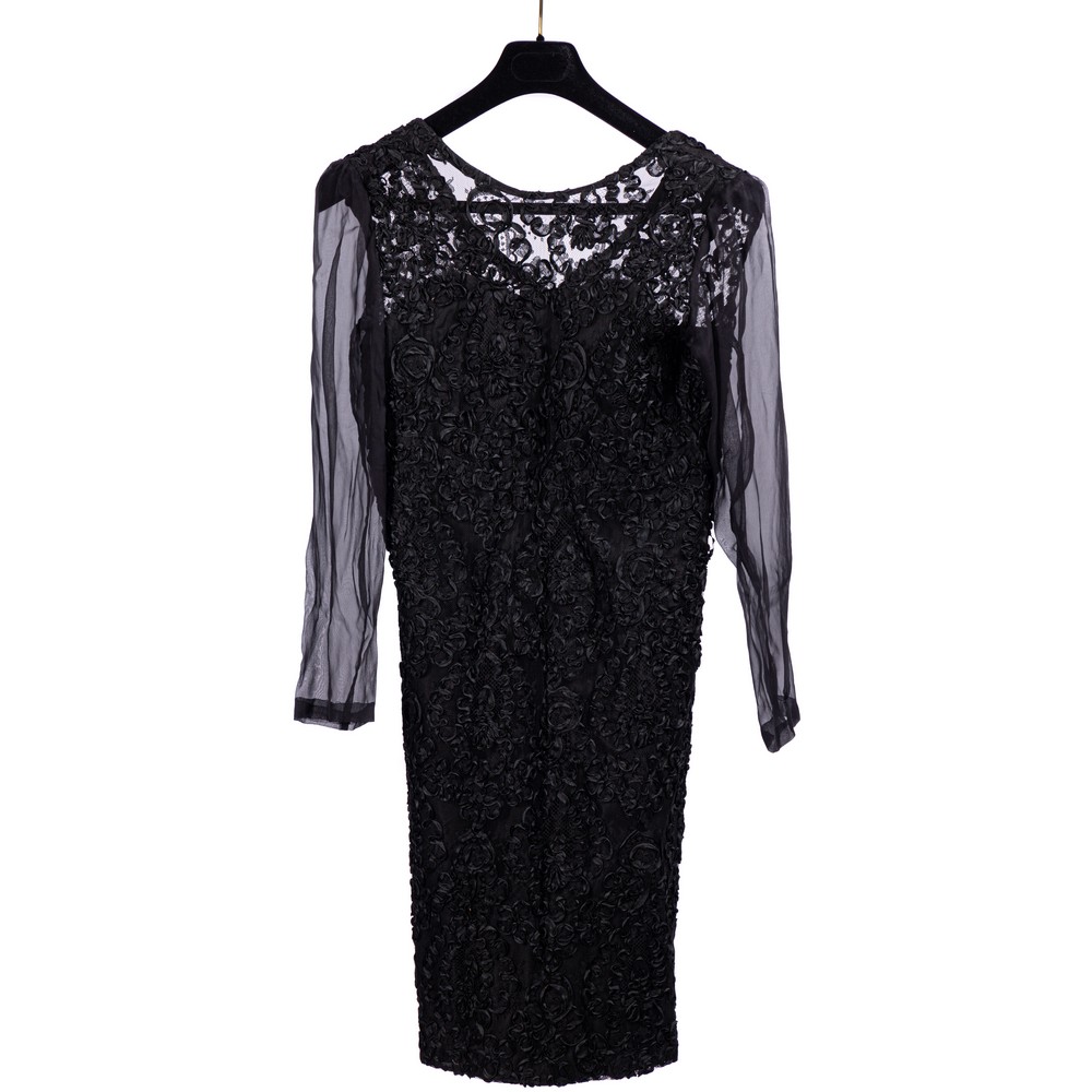 Abito da sera in un pezzo, rivestito in tulle color nero, interamente decorato da cordoncini di seta arricciati, color nero. Maniche fluttuanti in chiffon. Epoca 1960.