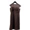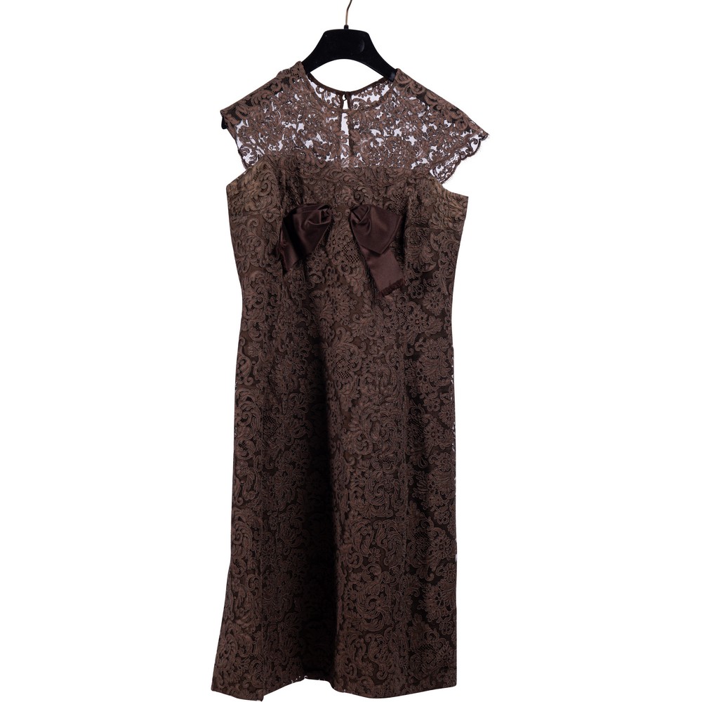 Abito femminile in un pezzo interamente in merletto meccanico tinto marrone puntellato sotto il seno da una grossa scocca in raso di seta, spalline ad alette e chiusura posteriore. Epoca 1950.