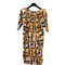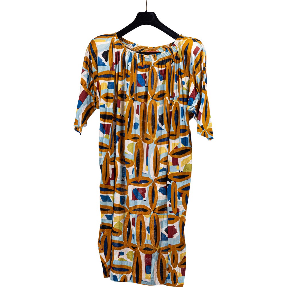 Abito femminile in cotone operato a fantasia nei colori ocra, celeste, bleu, giallo e nero. Con scollatura arricciata che determina una serie di plissettature verticali.