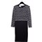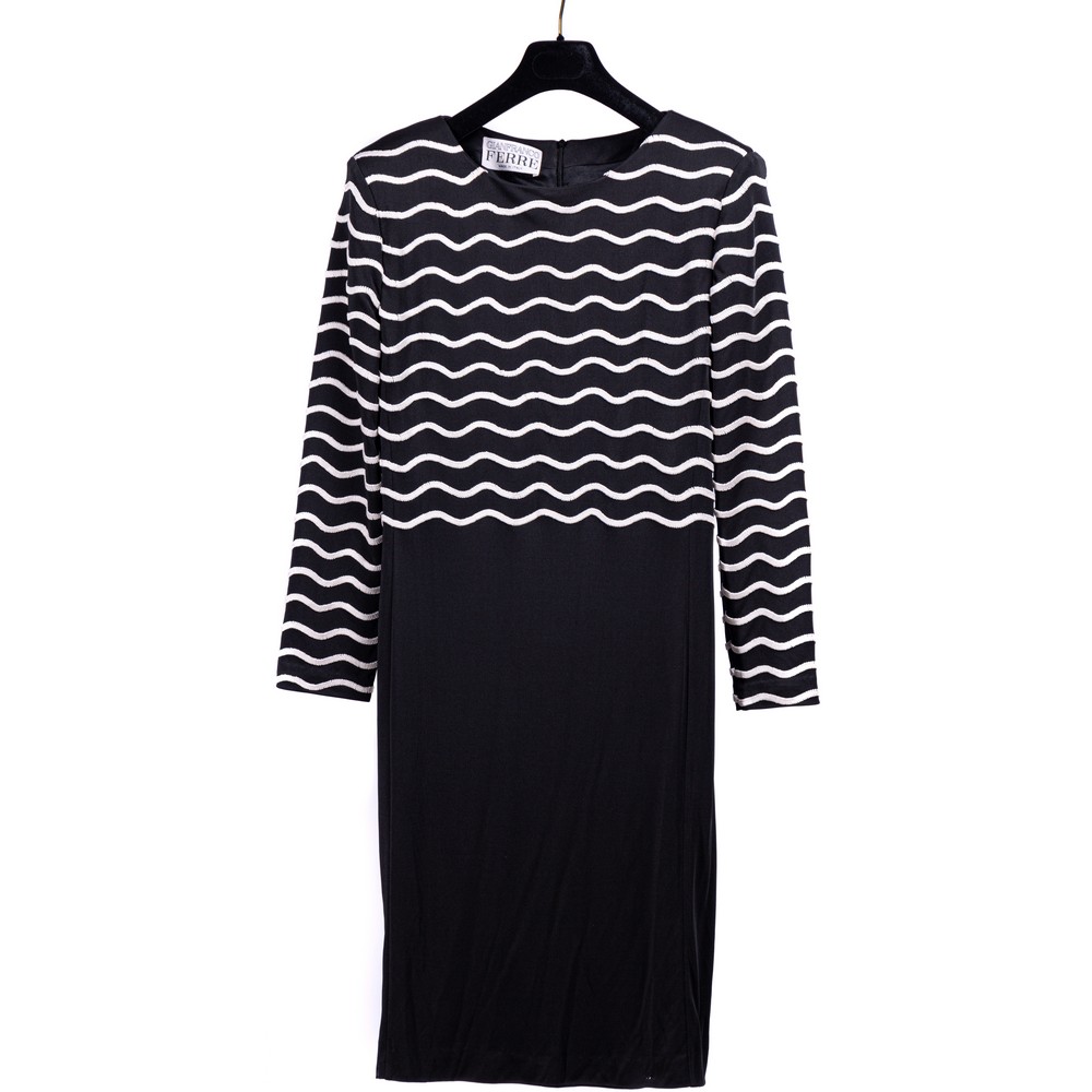 Abito da sera in un pezzo in cinz color nero, decorato nella parte superiore e nelle maniche con motivi ad onda in filo di seta color bianco.
