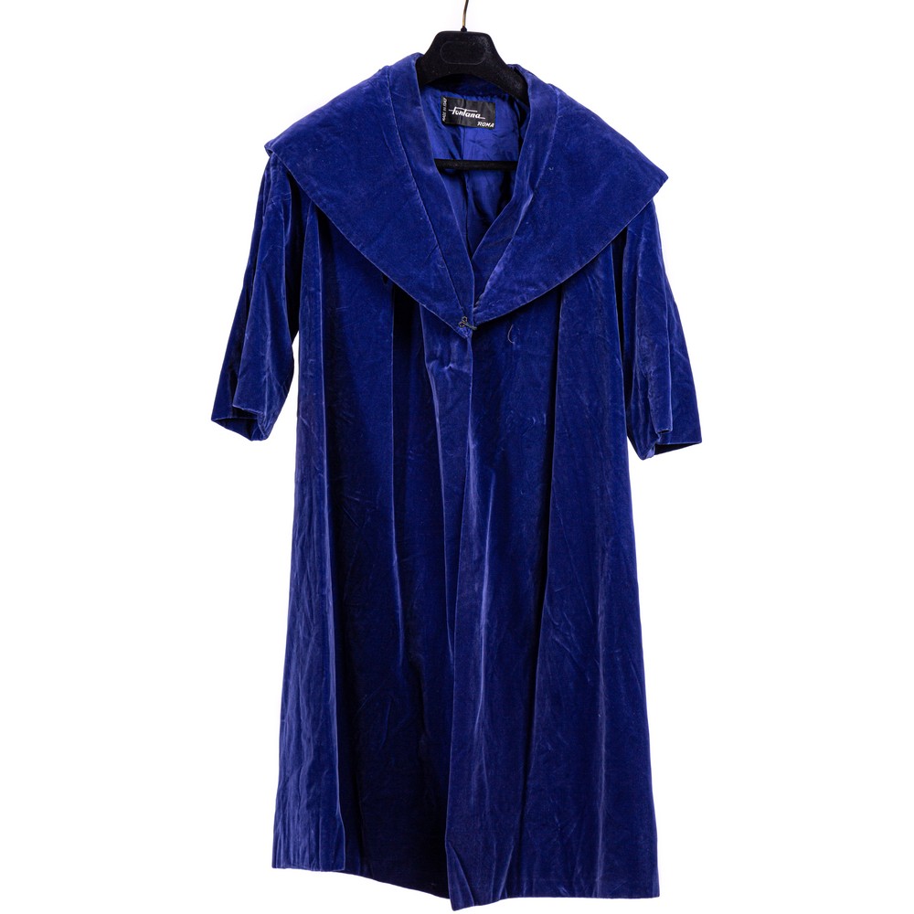 Soprabito in velluto color bleu, con ampia sciallatura nella parte centrale e chiusura a gancio, mezze maniche a campana. Etichetta “Fontana Roma”