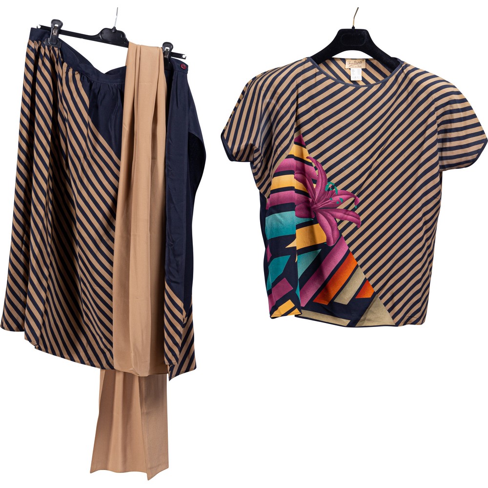 Abito Femminile due pezzi in seta operata a strisce blu e oro, decorata da un grande lilium color fucsia con inserti di colore rosa, celeste, fucsia e rosso, giacca a campana, gonna aperta a pareo leggermente movimentata e suo foulard in seta color nocciola. Etichetta: Fontana.