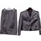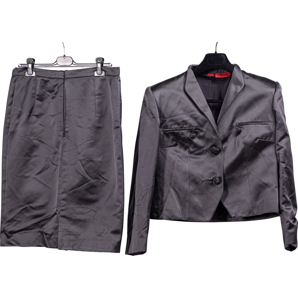 Tailleur in raso di seta color grigio fumo, giacca con colletto a revers fermata da due grossi bottoni foderati in coralline color nero e taschine fermate da cerniere e bottoni di coralline analoghi, manica fermata da cerniere e palline di corallina nera, la gonna scende tubolare. Etichetta: Valentino Night.
