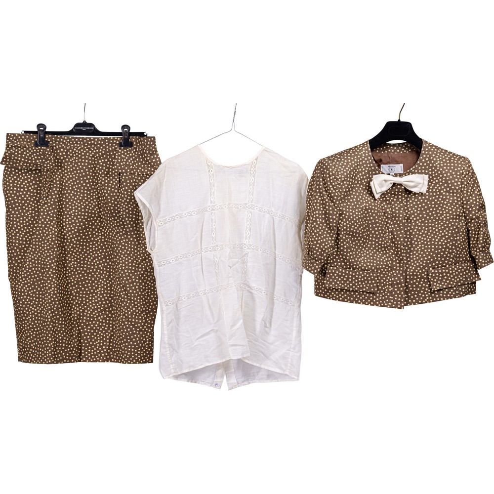 Tailleur in cotone e seta a piccoli pois color panna, giacca frontale fermata da quattro bottoni, un ampia scollatura decorata da un papillon, maniche a palloncino fermate da due bottoni dorati logati Valentino e due finti taschini sul frontale, gonna scende a calice e camicetta in lino operato da inserti di trine. Etichetta: Valentino, Made in France. Epoca 1960.