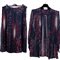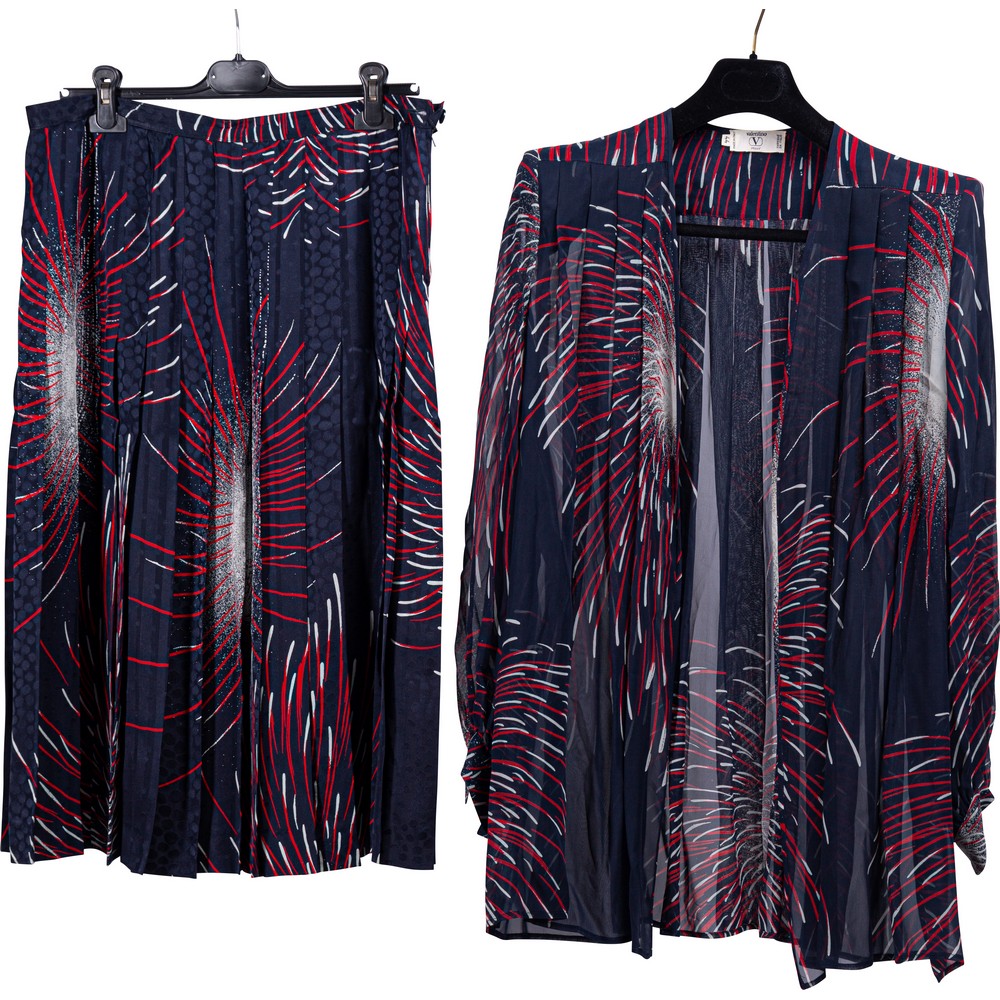 Abito da sera in seta color bleu notte operata a pois in bleu cangiante, con disegni di colore ad effetto giochi pirotecnici in argento, rosso e bianco, camicetta in leggerissimo chiffon di seta con le maniche aderenti, totalmente aperte e scollata nella parte frontale, gonna plissettata. Etichetta: Valentino Miss V, Fabrique en Italy. Epoca 1970.