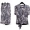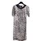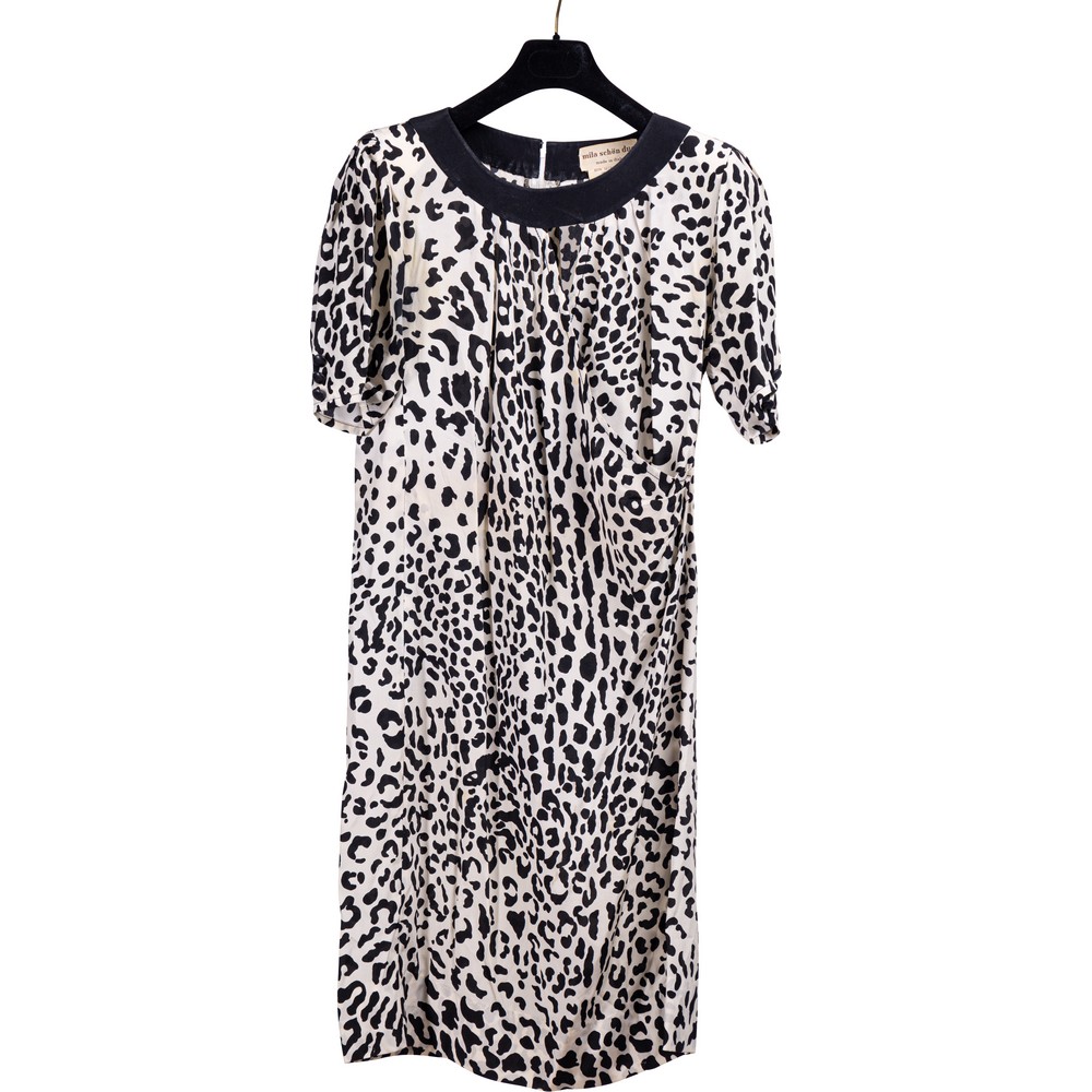 Abito da sera in seta color grigio chiaro operato a macchie di leopardo color nero. Ampia scolatura contornata da un vasto bordo di seta nera, maniche a campana fermate da tre bottoni di bachelite color nero. Etichetta: Mila Schon, Made in Italy.