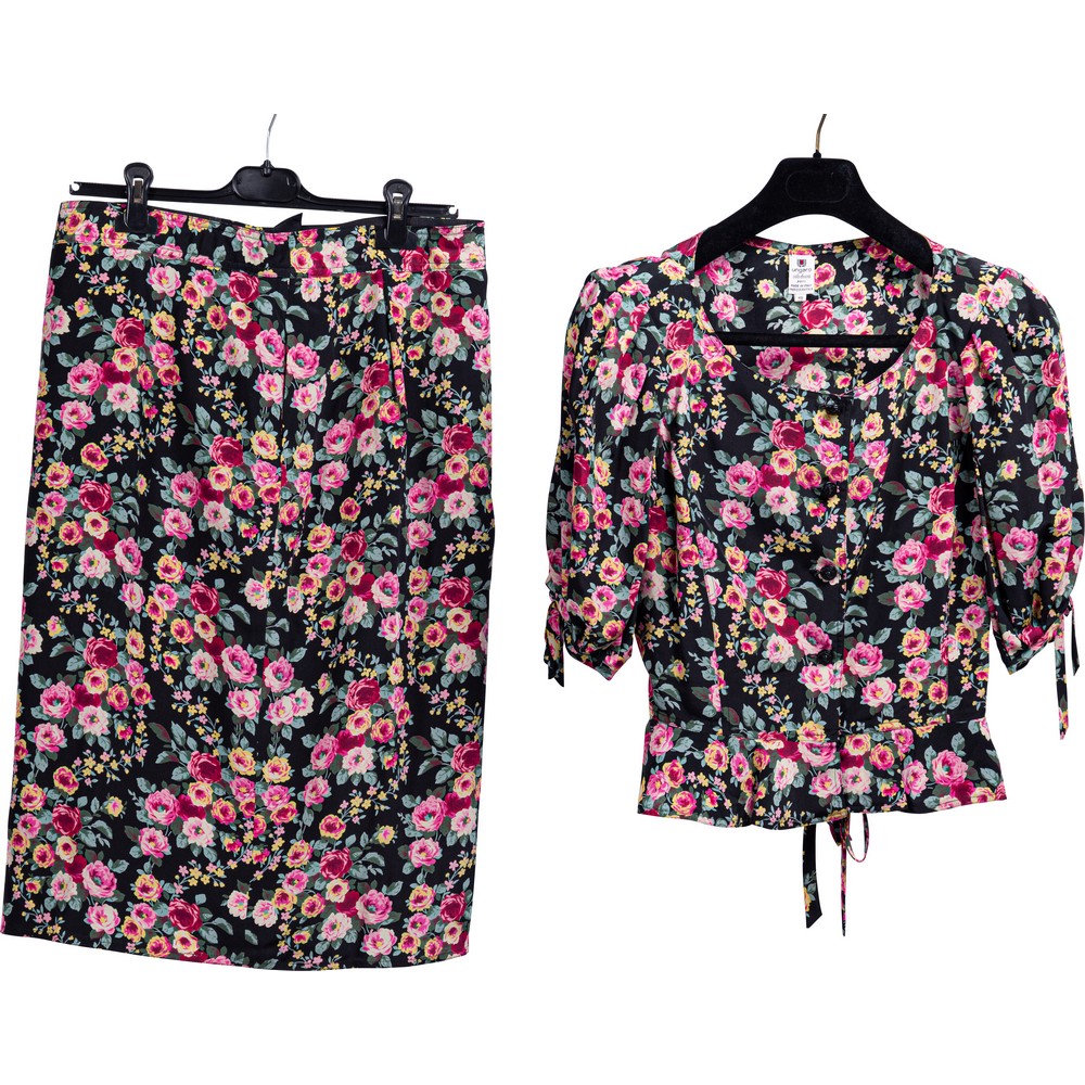 Abito femminile in due pezzi in seta color nero, operato a stampa con motivi floreali (rose), chiusura frontale della giacca è fornita di cinque bottoni in bachelite decorati con rosee maniche a palloncino chiuse da nastrini. Il punto vita è evidenziato da un volano arricciato con gonna a calice.