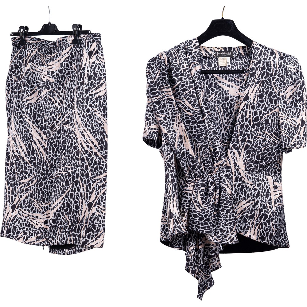 Abito femminile in due pezzi in seta operata color nero e argento. La giacca è chiusa nella parte frontale da una fasciatura bloccata da un cinturino, maniche a palloncino e gonna tubolare. Etichetta: Joe Colombo Milano.