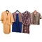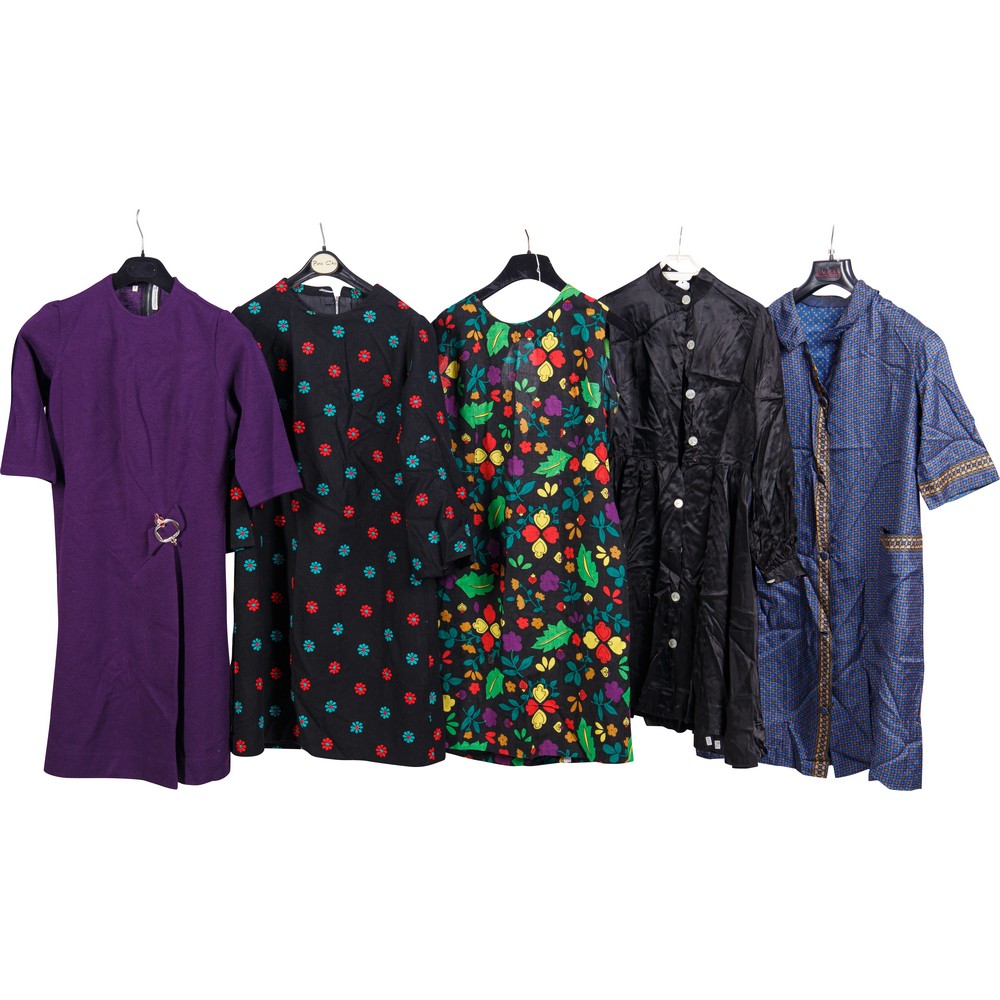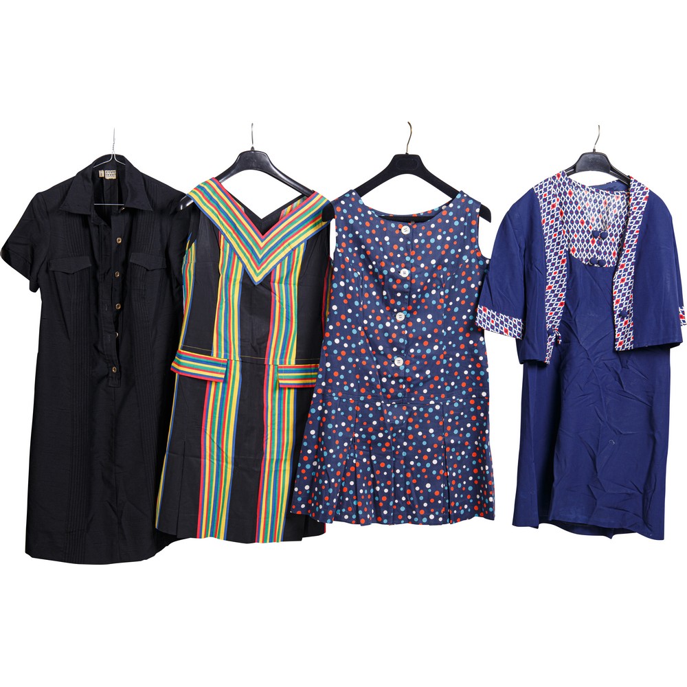 Abito femminile in panno color nero puntellato da piccole margherite infilo di seta nei colori rosso e verde acqua; uno in panno nero con fiori e foglie di diverso colore; uno in tessuto vila con fibbia in strass; uno nero con abbottonatura anteriore con collo alla coreana; uno blu a fantasia cammello con tasche applicate; un abito con giacca beige con ricami; un abito blu con tasche e parte superiore in scozzese giallo; un abito con giacca viola con fiori e ramges gialli; un abito e giacca con collo a barca a fantasia marrone e blu; uno chemisier nero; un abiti nero a righe multicolor; un abito bleu con pois rossi, turchesi e bianchi; un abito con giacca bleu e fantasia geometrica bianca e rossa.