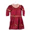 Abito da bambina in raso di seta color rosso bordeaux ornato da passamanteria in filo d’argento e bordi in nastro di seta operato cachemire bordato da ventaglietti di ciniglia, collo arricchito da una balza di merletto.