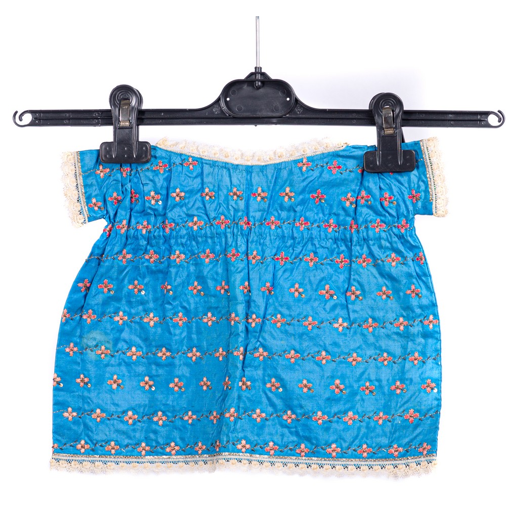 Abitino per neonato in seta cruda color celeste interamente rivestito con ricami a fascia in filo d'argento e piccoli fiorellini con petali ricamati in seta color rosa, puntellati da filigrana d'argento e paillettes. La scollatura, le maniche e il bordo inferiore sono contornati da una doppia fascetta di canutiglia d'argento e da un bordo di trina. La chiusura della scollatura è fatta ad arricciamento ed è servita da un nastrino di seta, l'arricciamento della vita è servito da un nastrino di lino. La fodera interna è in finissima garza. Epoca 1800.