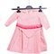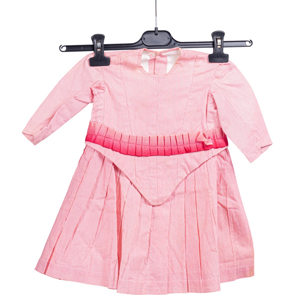 Abito per bimba (un anno e mezzo) in cotone operato a righine color rosa, corpino a spiovente sia sul fronte che sul retro, chiusura posteriore fornita di 5 asole e 5 bottoni in madreperla intagliata e fodera del corpino in lino. Punto vita delimitato da una fascia di seta color rosso – rosa. Epoca 1868.