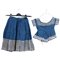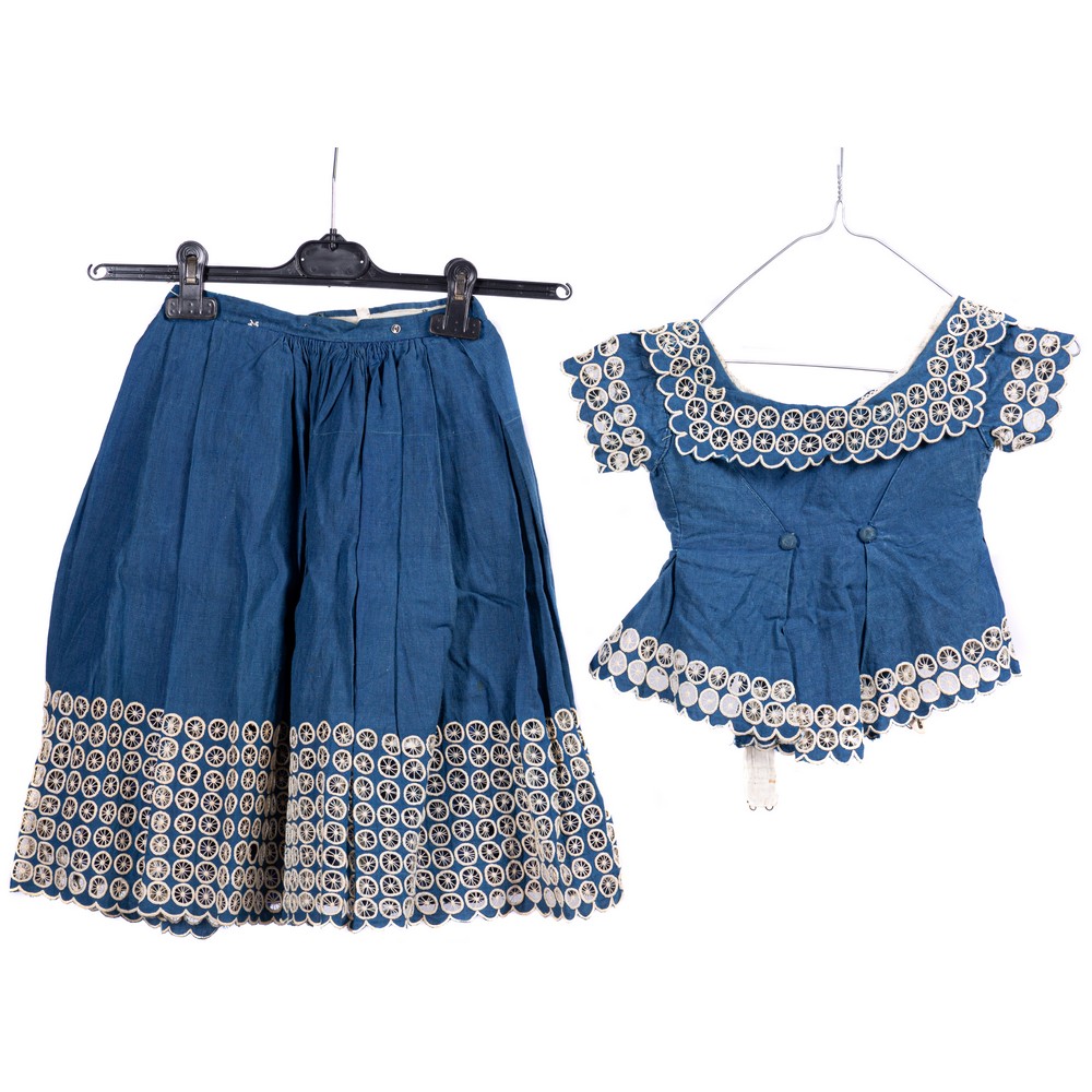 Abito per bimba (10 anni circa) in cotone color bleu, arricchito lungo il collo, sul petto, nelle maniche e al punto vita da inserti di ricami a ruota a fuselli ,chiusura frontale a tre ganci, gonna in cotone bleu , fornita di un sottogonna in lino cirè e di una piccola taschina frontale, ed è arricchita nella parte terminale da una vasta e pomposa fascia di ricamo ai fuselli. Epoca 1880.