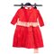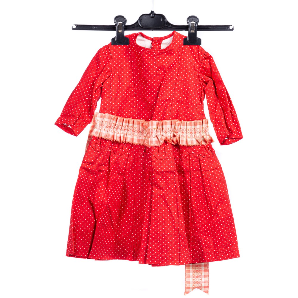 Abito per bimba (un anno e mezzo) in cotone color rosso operato a piccoli pois bianchi, chiusura posteriore con cinque asole e cinque bottoni in madreperla intagliata. Taglio a vespa con alla vita ventaglietti dello stesso tessuto e fascia in seta operata color rosa e bianca arricciata sul davanti con fiocco posteriore. Epoca 1867.