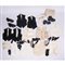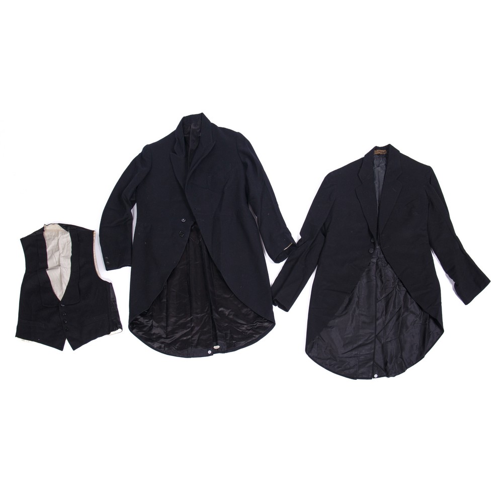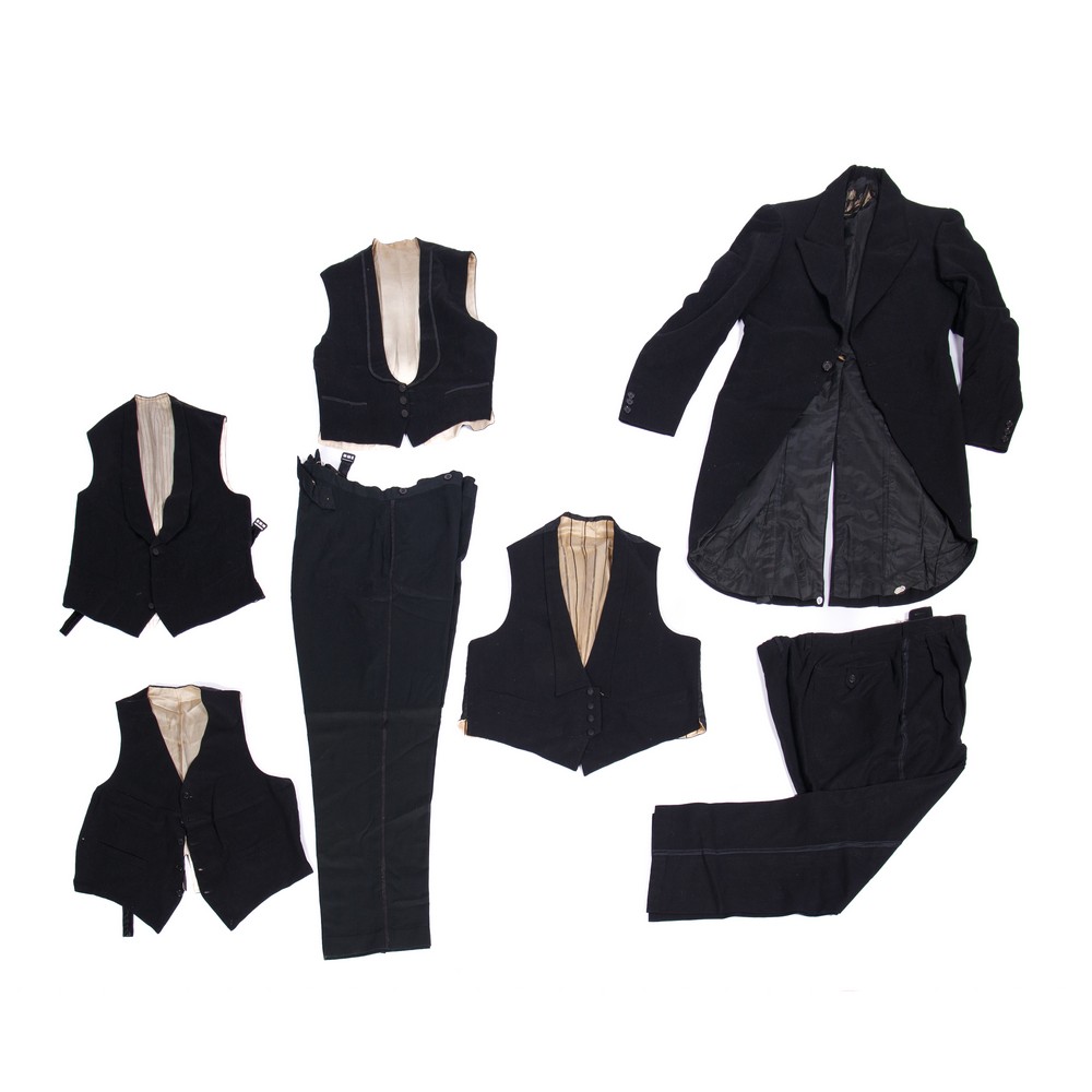 Quattro panciotti neri da frac, sette in piquet bianco, tre Tight composti da giacca e panciotto, due pantaloni con carabiniera, tre gilet, vari papillon e cravatte in seta, un paio di maniche con polsini primi del '900. Un paia di scarpe da tight in pelle nera. Scarpe maschili in pelle nera con allacciatura laterale sagomata a ventaglio. Epoca 1880.