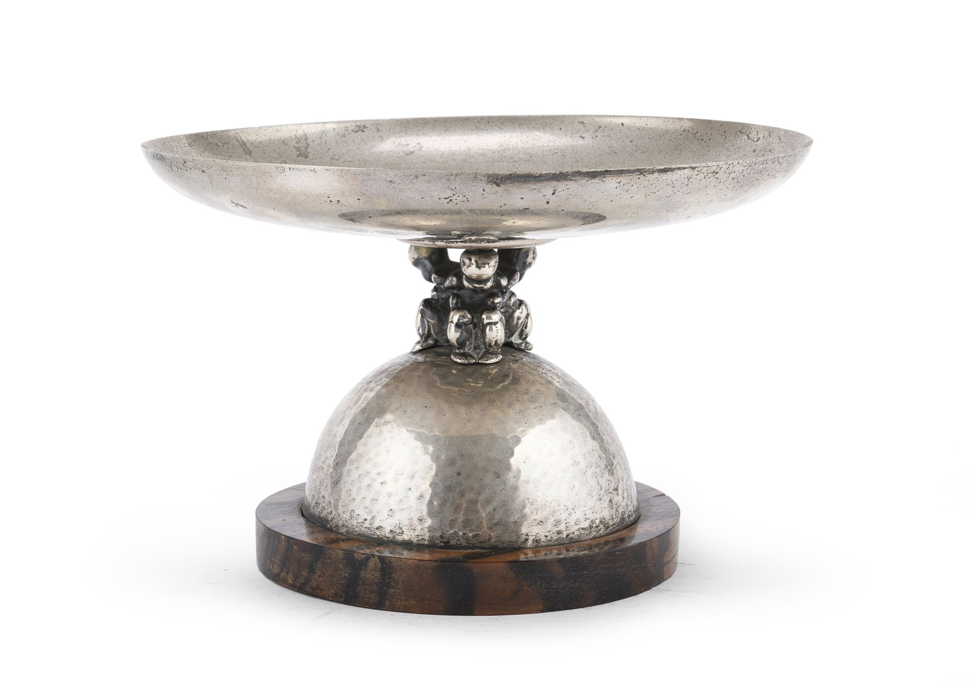 con base martellata e decoro a putti che sostengono la vaschetta.