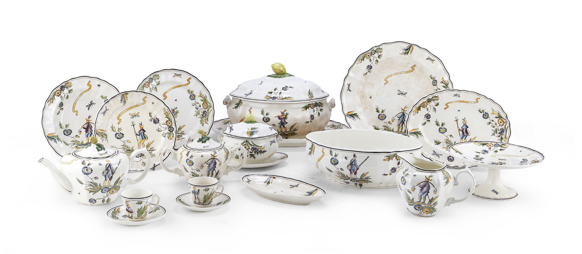 in terraglia policroma, con decoro a rami fioriti e fogliati e figure raffiguranti il cacciatore, il civettaro, il viandante, l’acquaiolo, descritti in cartiglio. Composto da ventisette piatti piani, nove fondine, dieci piattini, tre antipastiere, due alzate, una insalatiera, un piatto da portata, una salsiera, una zuppiera, una teiera, una lattiera, una zuccheriera e otto tazzine con piattini.
